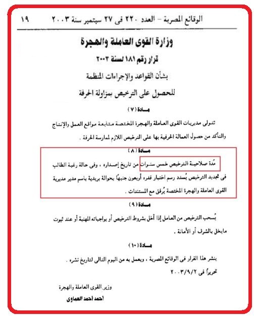 كما نص في المادة 8 على أن مدة صلاحية الترخيص 5 سنوات من تاريخ إصداره، وفي حالة رغبة الطالب في تجديد الترخيص، يسدد رسم اختبار قدره 40 جنيها بحوالة بريدية باسم مدير مديرية القوى العاملة والهجرة يرفق مع المستندات.