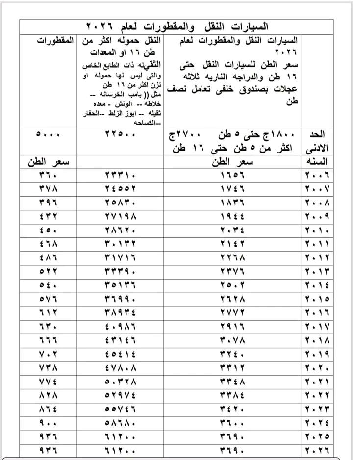 كما شملت الرسوم السيارات المحلية، حيث تم تحديد قيم مختلفة حسب سنة الموديل، على أن تبدأ الرسوم من 720 جنيهًا كحد أدنى.