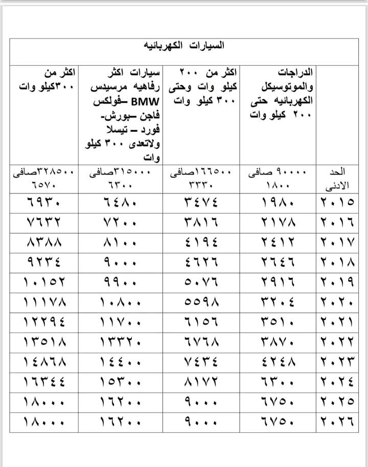 وفيما يتعلق بـ السيارات الكهربائية، فقد جرى تصنيفها وفق القدرة الكهربائية بالكيلو وات، بداية من الدراجات الكهربائية والسيارات حتى 200 كيلو وات، ثم من 200 إلى 300 كيلو وات، وأكثر من 300 كيلو وات، مع فرض رسوم تبدأ من 1,800 جنيه، وتصل إلى 18 ألف جنيه في الفئات الأعلى.