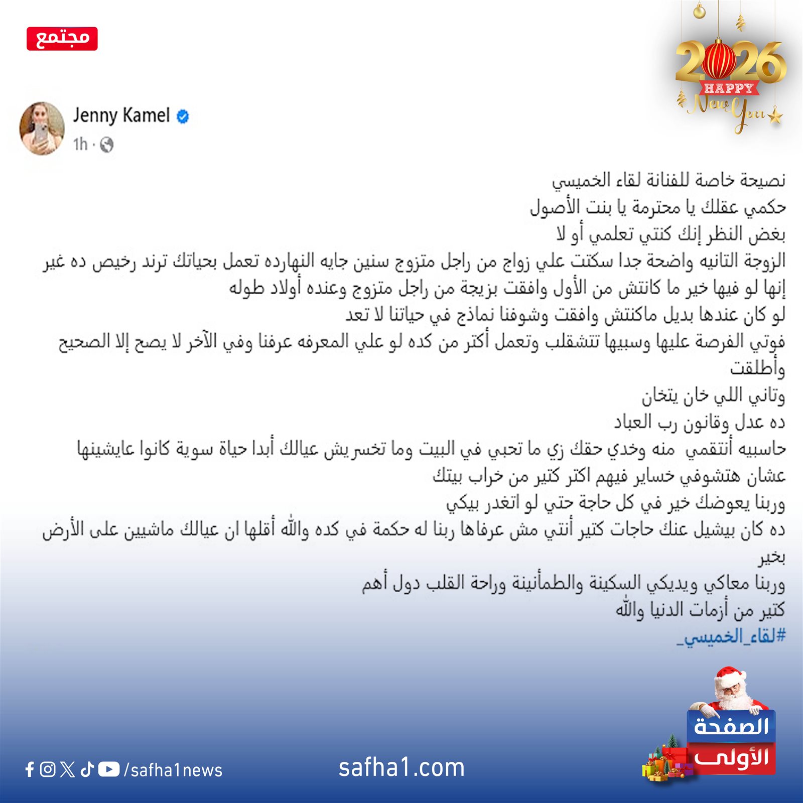 وكتبت جينى كامل عبر حسابها على «فيس بوك»: «نصيحة خاصة للفنانة لقاء الخميسى، حكمى عقلك يا محترمة يا بنت الأصول، بغض النظر إنك كنتى تعلمى أو لا، الزوجة التانية واضحة جدا سكتت على زواج من راجل متزوج سنين جاية النهارده تعمل بحياتك ترند رخيص ده غير إنها لو فيها خير ما كانتش من الأول وافقت بزيجة من راجل متزوج وعنده أولاد طوله».