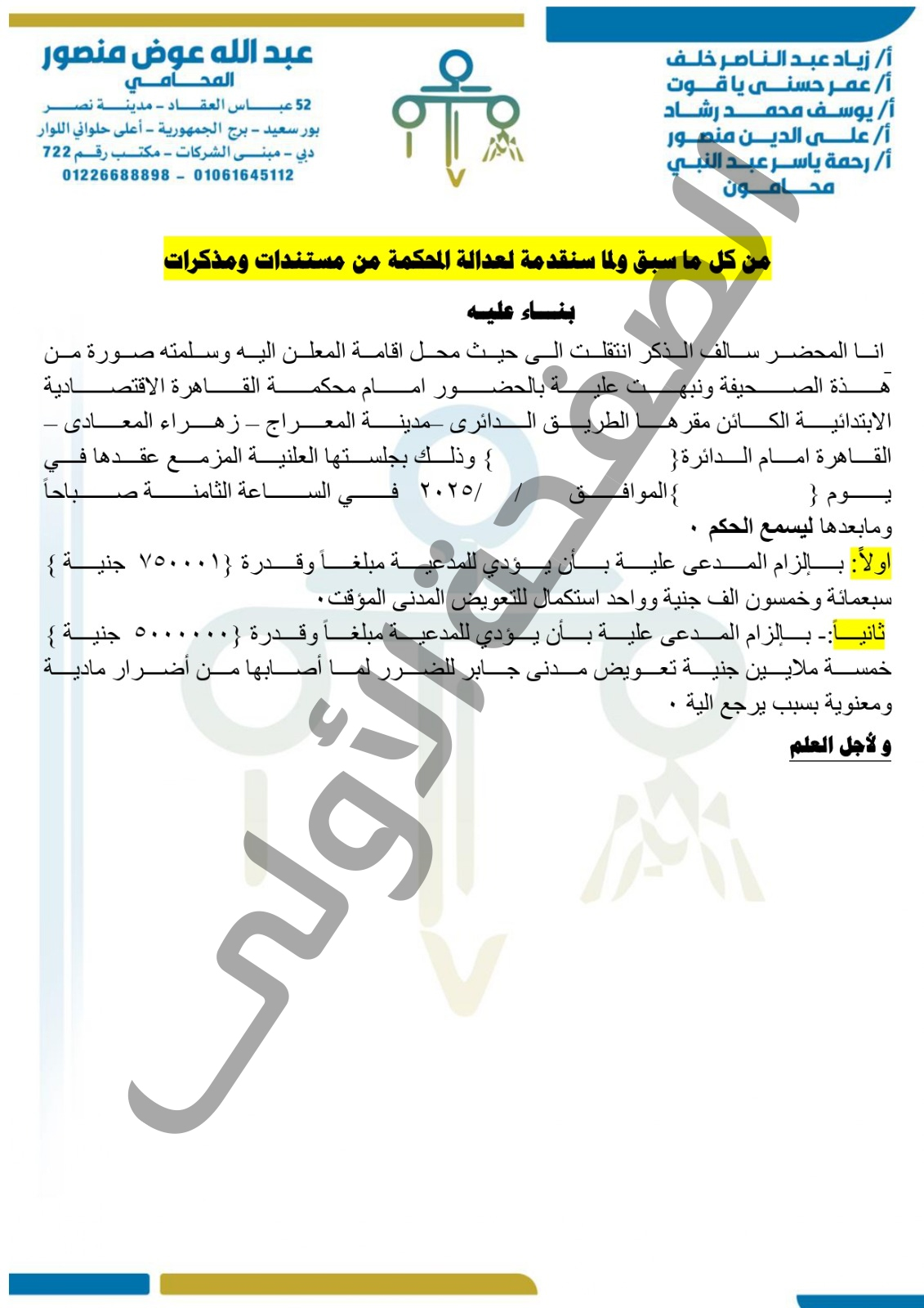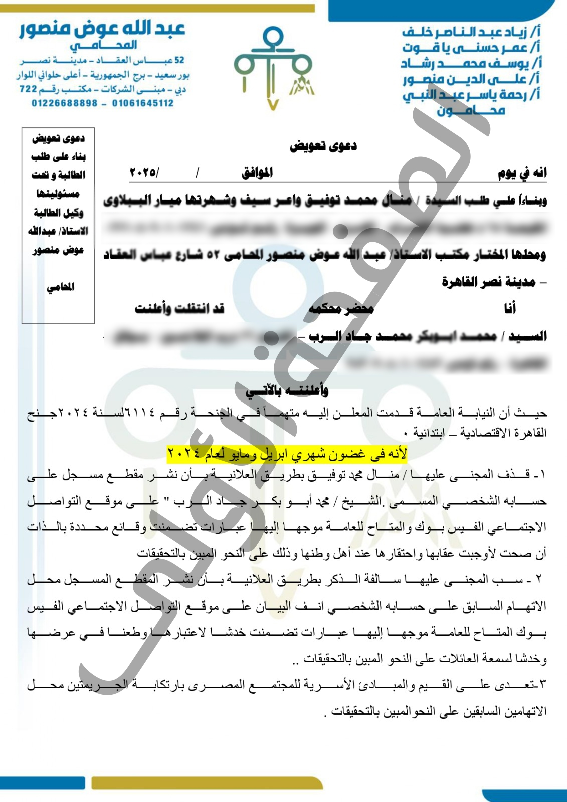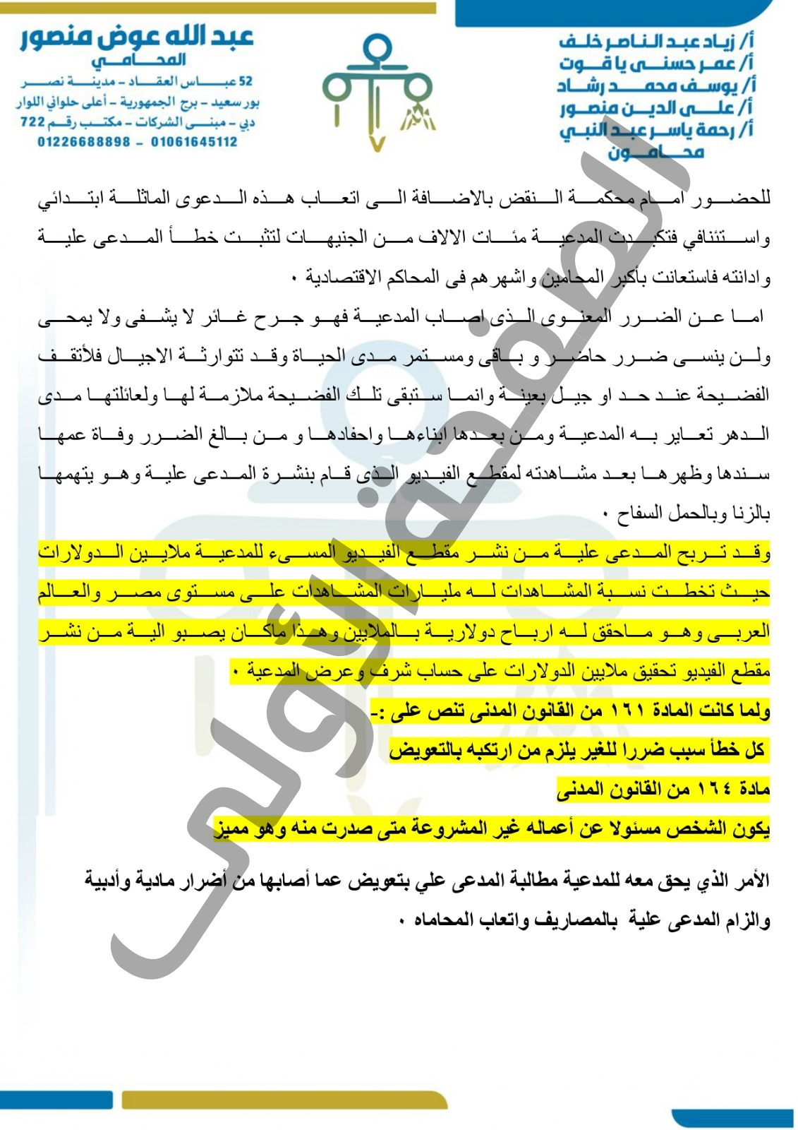 وتنشر «الصفحة الأولى» صحيفة دعوى التعويض التي رفعتها الإعلامية ميار الببلاوي ضد الشيخ محمد أبو بكر، واستند فيها إلى إدانة المدعى عليه بتهمة سب وقذف المدعية واتهامها بالزنا وبالحمل سفاحا، وذلك في 3 درجات قضائية "ابتدائي واستئناف ونقض"، وأصبح الحكم الجنائي نهائي وبات وحاز حجية الأمر المقضي به.