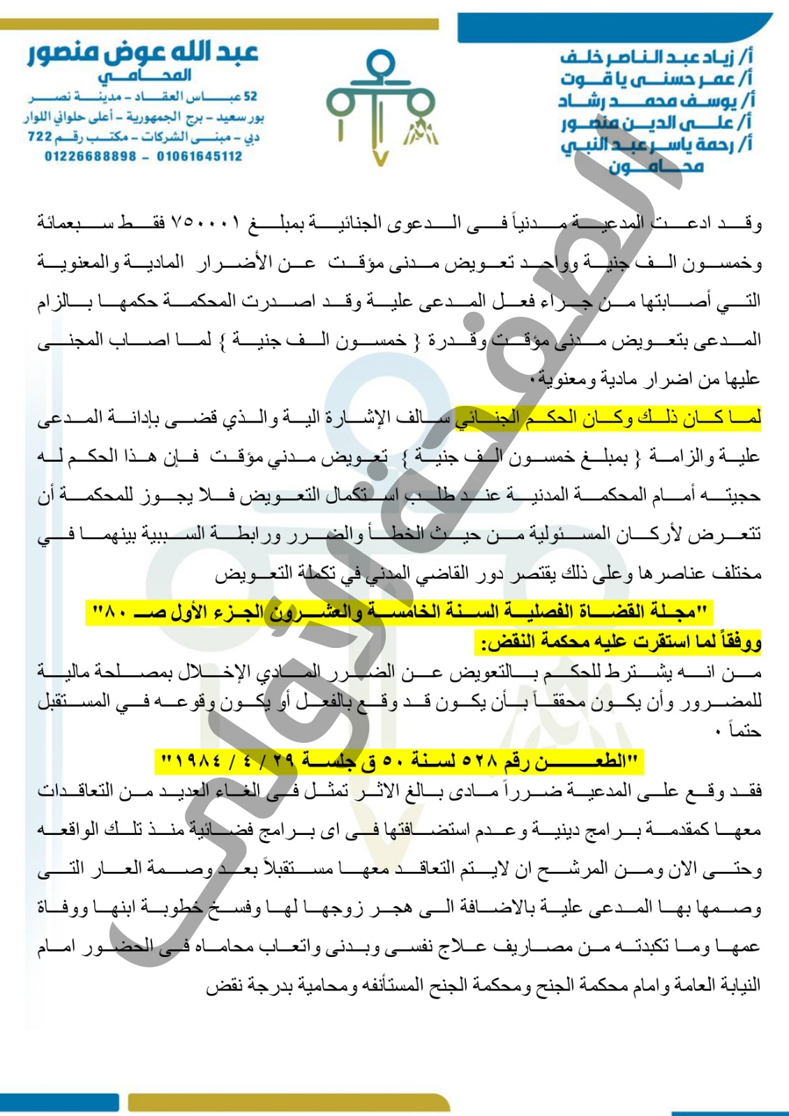 وأضاف المحامي أن موكلته ميار الببلاوي وقع عليه ضررا ماديا بالغ الأثر، تمثل في الغاء العديد من التعاقدات معها كمقدمة برامج دينية، وعدم استضافتها في أي برامج فضائية منذ تلك الواقعة وحتى الآن، ومن المرشح ألا يتم التعاقد معها مستقبلا، بعد وصمة العار التي وصمها بها المدعى عليه، بالإضافة الى هجر زوجها لها، وفسخ خطوبة ابنها، ووفاة عمها، وما تكبدته من مصاريف علاج نفسي وبدني وأتعاب محاماة في الحضور أمام النيابة العامة وأمام محكمة الجنح ومحكمة الجنح المستأنفة ودرجة النقض.