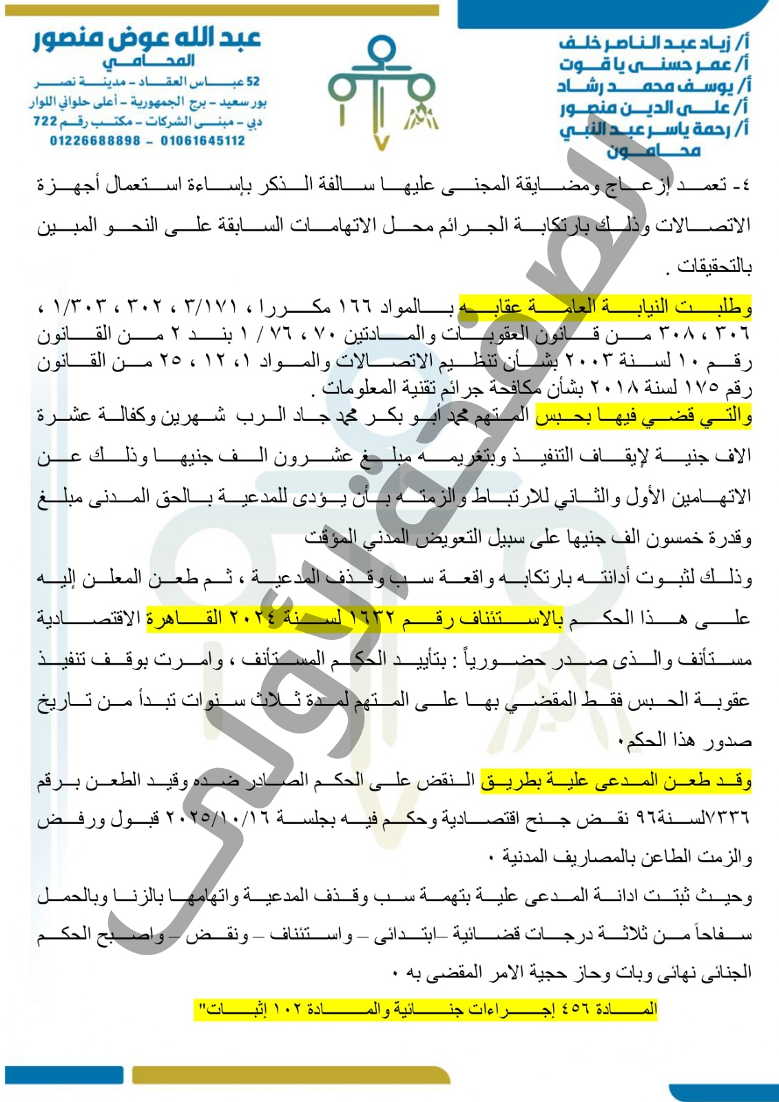 وطعن المدعى عليه على حكم الاستئناف بطريق النقض، وقيد الطعن برقم 7336 لسنة 96 نقض جنح اقتصادية، وحكم فيه بجلسة 16/ 10 / 2025، بقبول ورفض وألزمت الطاعن بالمصاريف المدنية.