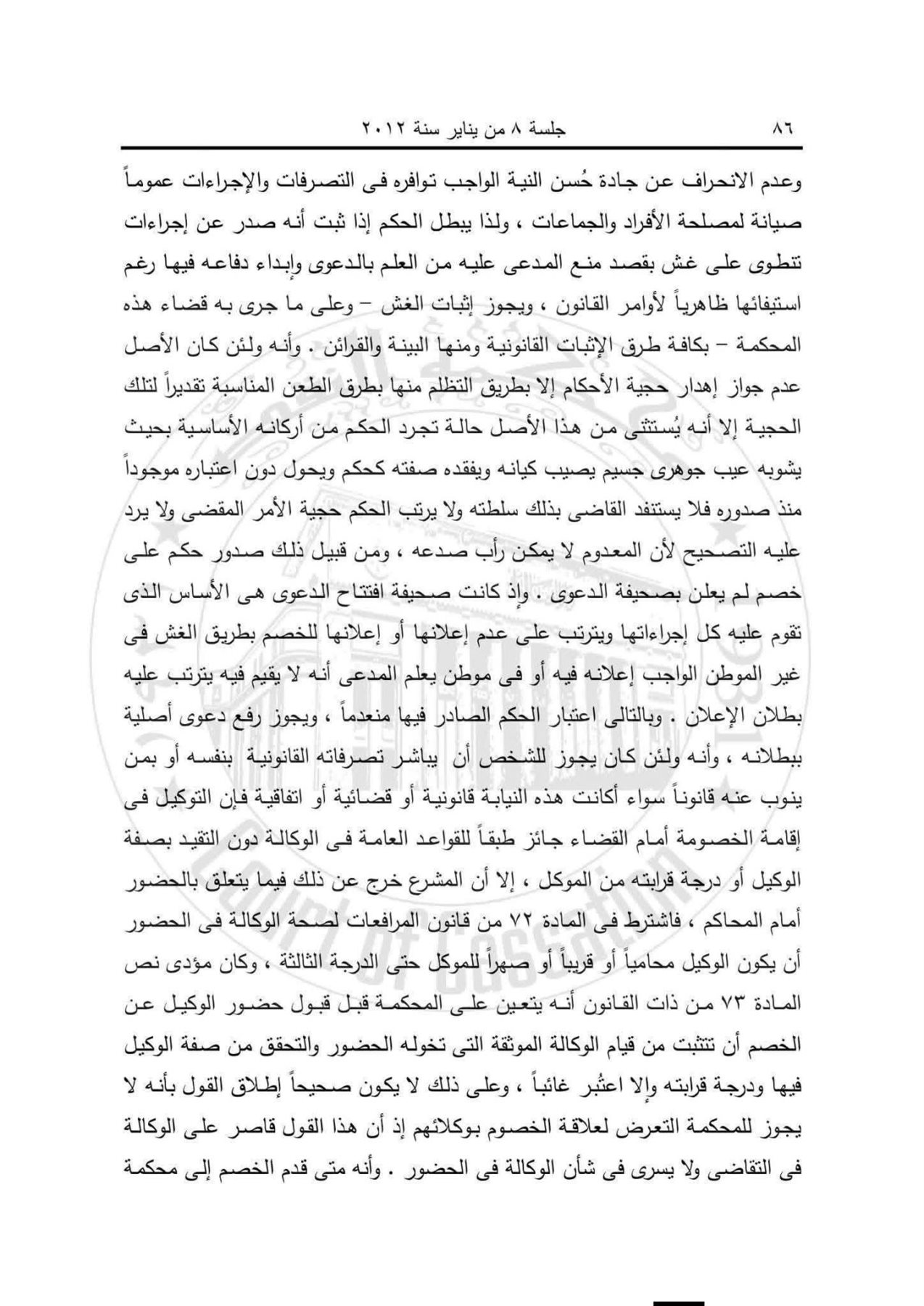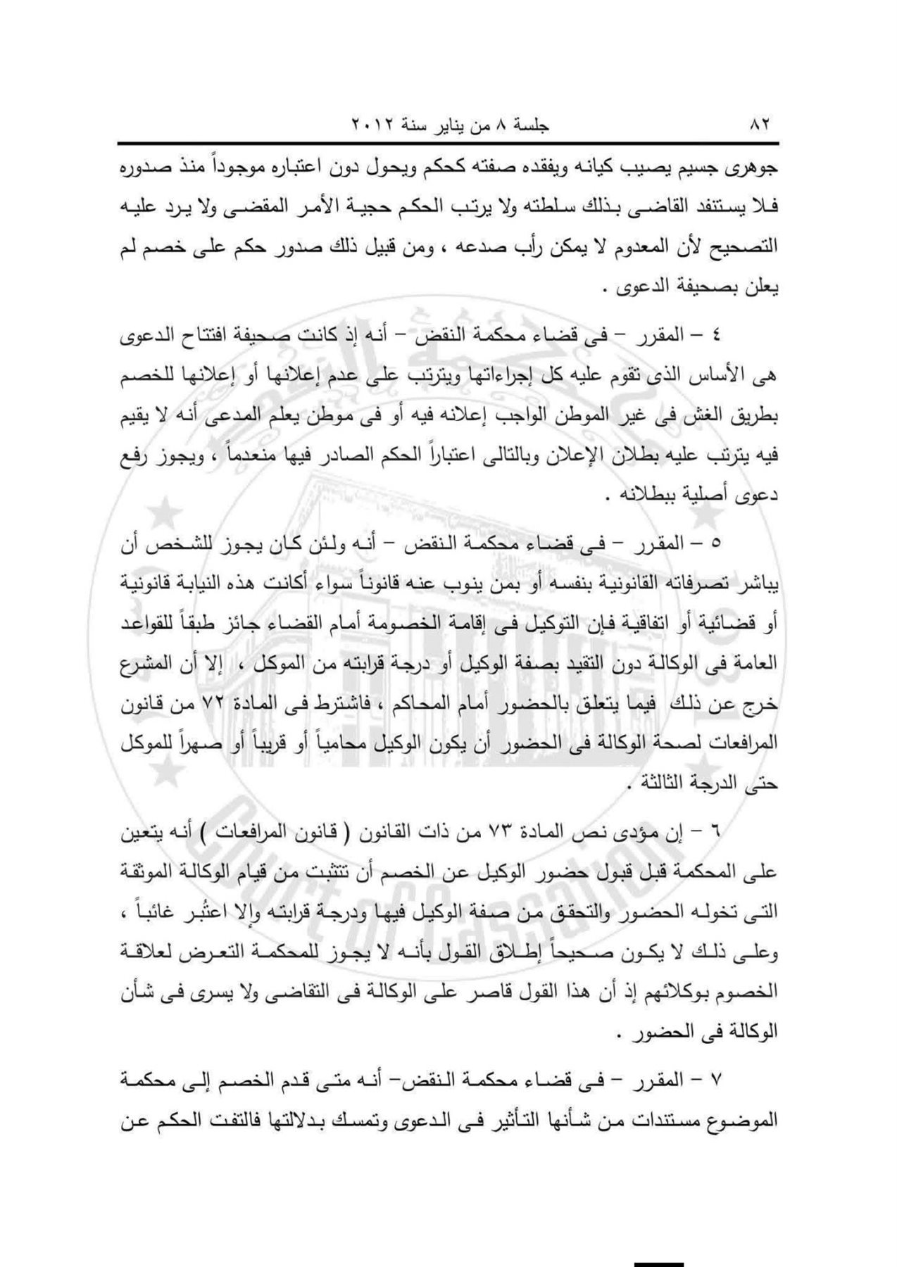وقررت محكمة النقض أيضا أن الحضور أمام المحكمة يختلف عن الوكالة في التقاضي، وأنه يشترط في الوكيل الحاضر أن يكون محاميًا أو قريبًا أو صهرًا حتى الدرجة الثالثة، وإلا اعتُبر الخصم غائبًا، ولا يصحح هذا الحضور بطلان الإعلان.