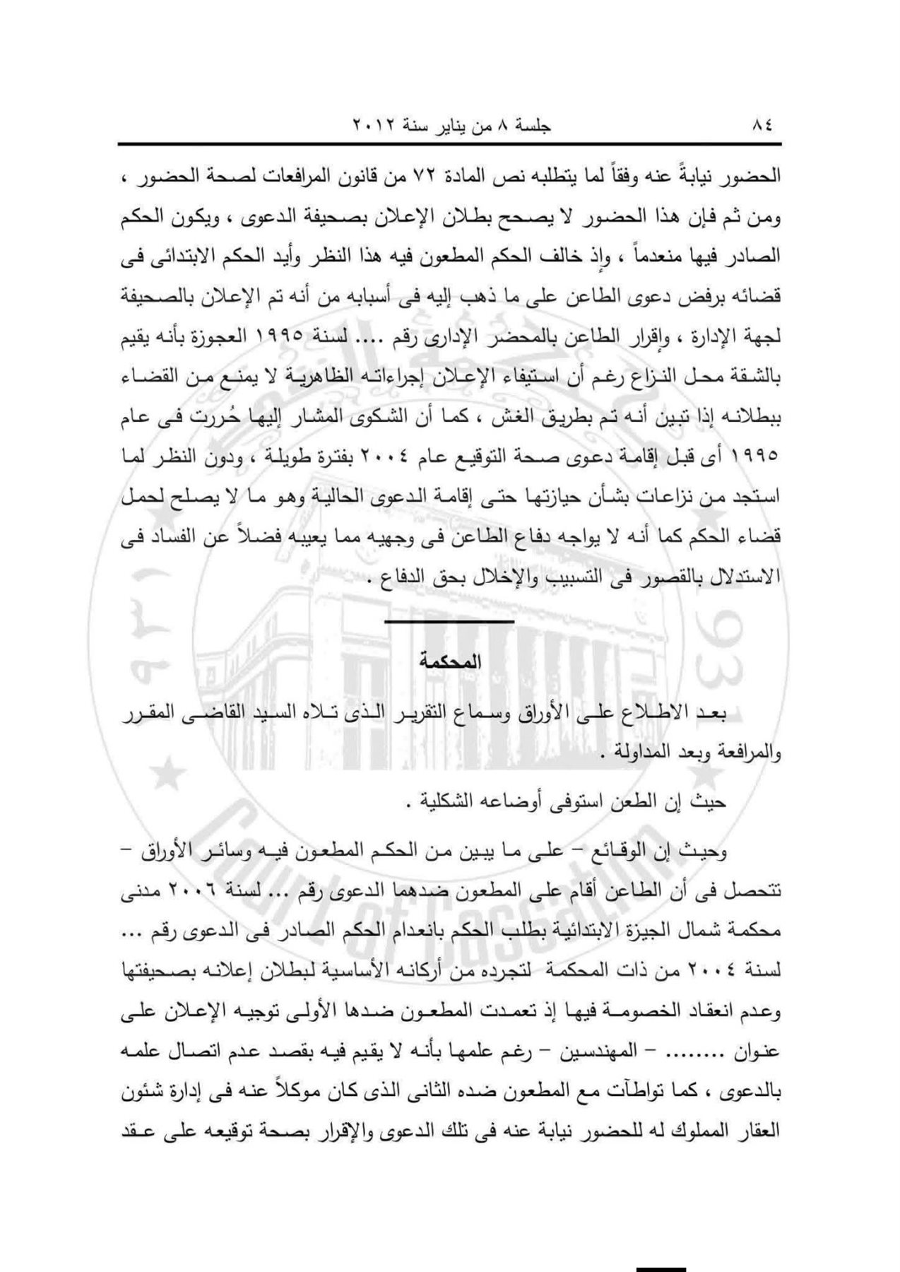 وأضافت النقض أن حضور وكيل لا تتوافر فيه شروط الحضور المنصوص عليها بالمادة 72 من قانون المرافعات لا يصحح بطلان الإعلان، ولا تنعقد به الخصومة، وأن إثبات الغش جائز بكافة طرق الإثبات، بما فيها البينة والقرائن، كما أن التفات الحكم عن مستندات جوهرية تمسك الخصم بدلالتها يُعد قصورًا في التسبيب يوجب نقضه.