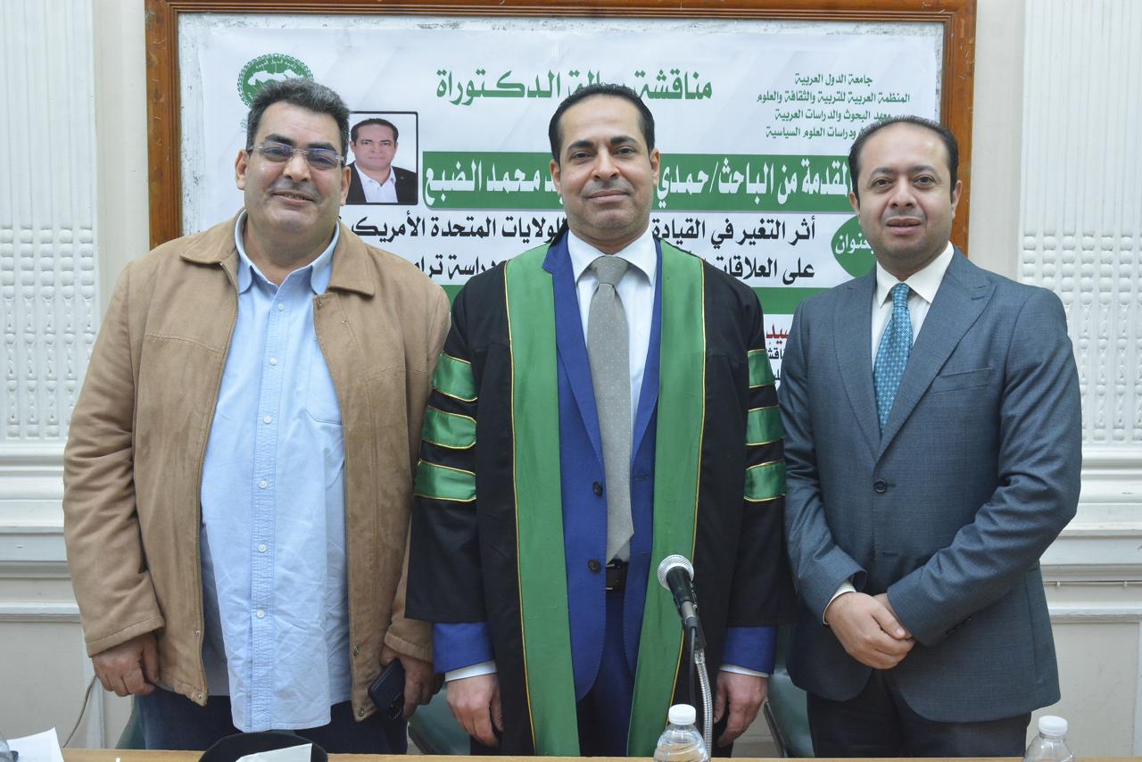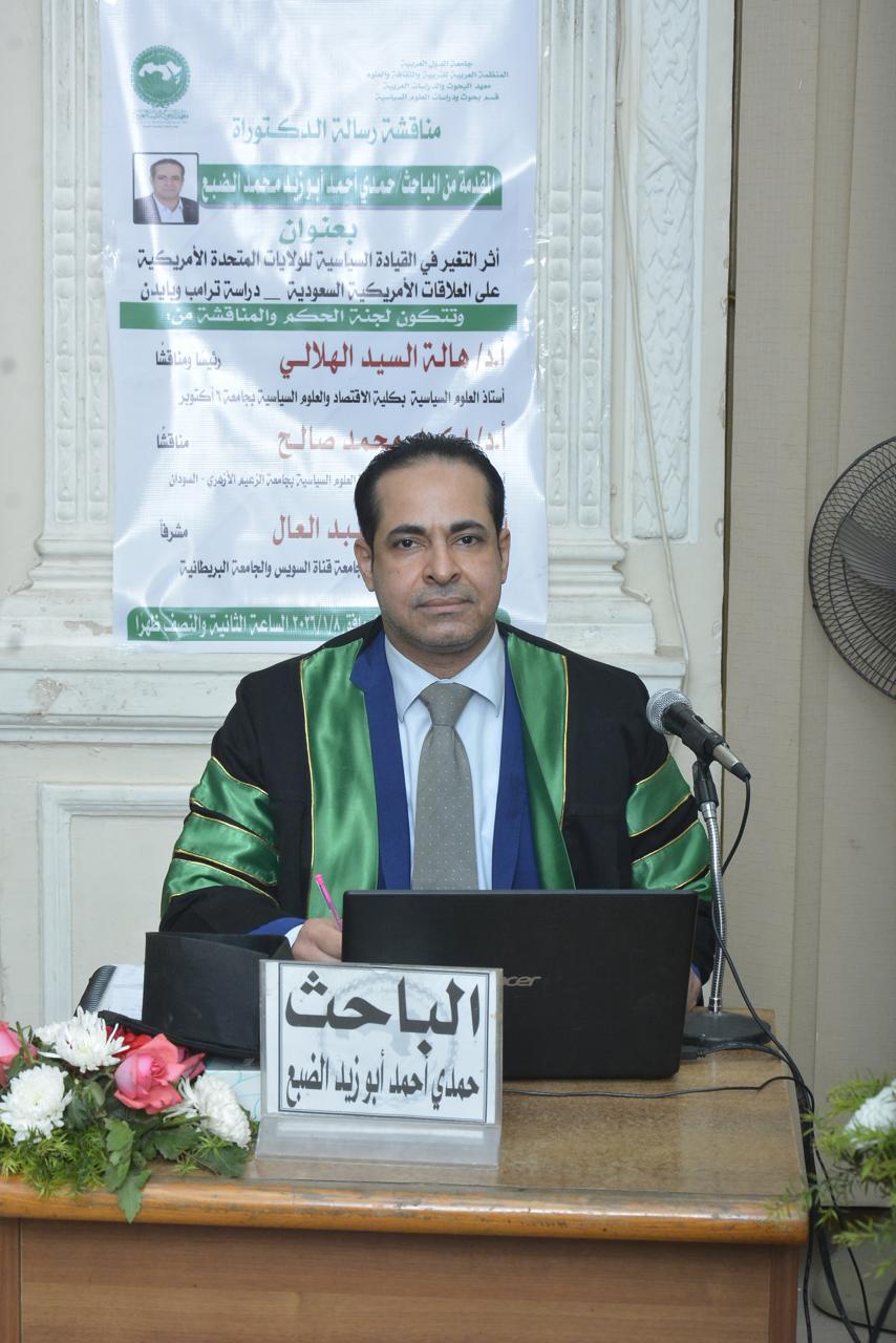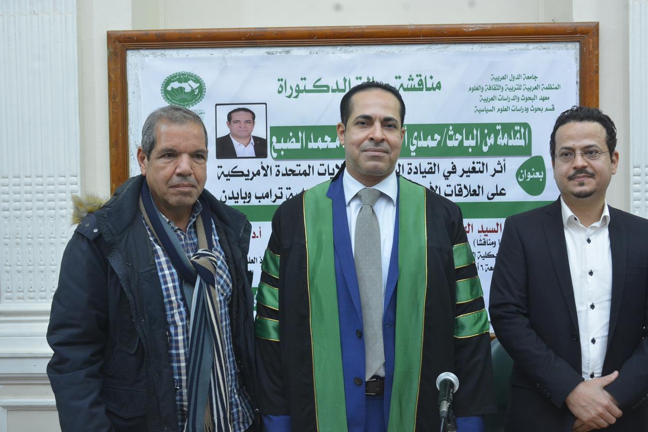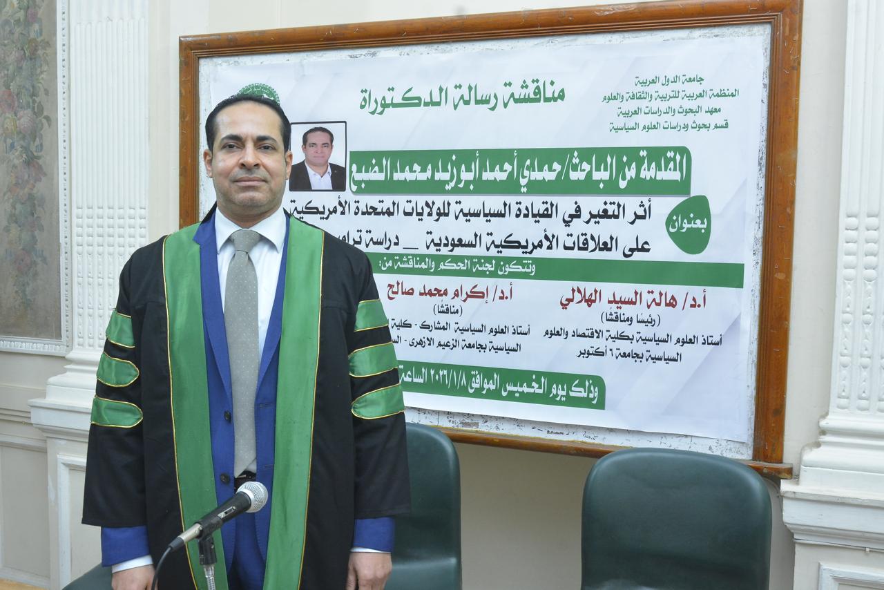 حصل الباحث حمدي أحمد أبوزيد الضبع، أمس الخميس، على درجة الدكتوراه في العلوم السياسية والعلاقات الدولية، بتقدير امتياز مع مرتبة الشرف الأولى، عن أول دراسة مقارنة في الوطن العربي بين سيكولوجية ترامب وبايدن، وذلك من معهد البحوث والدراسات العربية التابع للمنظمة العربية للتربية والثقافة والعلوم بجامعة الدول العربية، وجاءت رسالة الدكتوراه بعنوان "أثر التغير في القيادة السياسية للولايات المتحدة الأمريكية على العلاقات الأمريكية السعودية (دراسة ترامب وبايدن) خلال الفترة من 2017 إلى 2025.