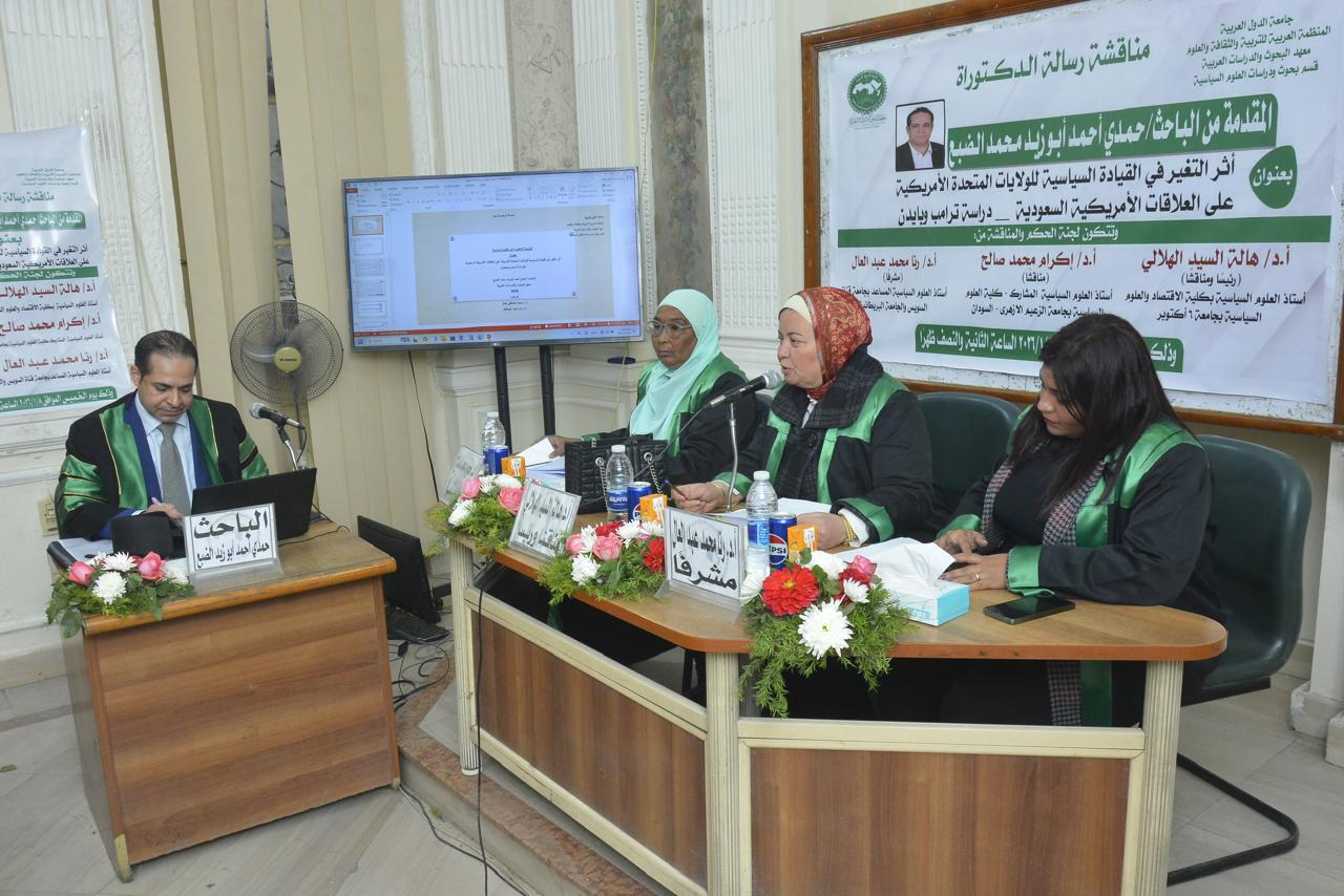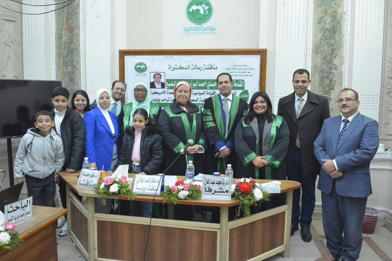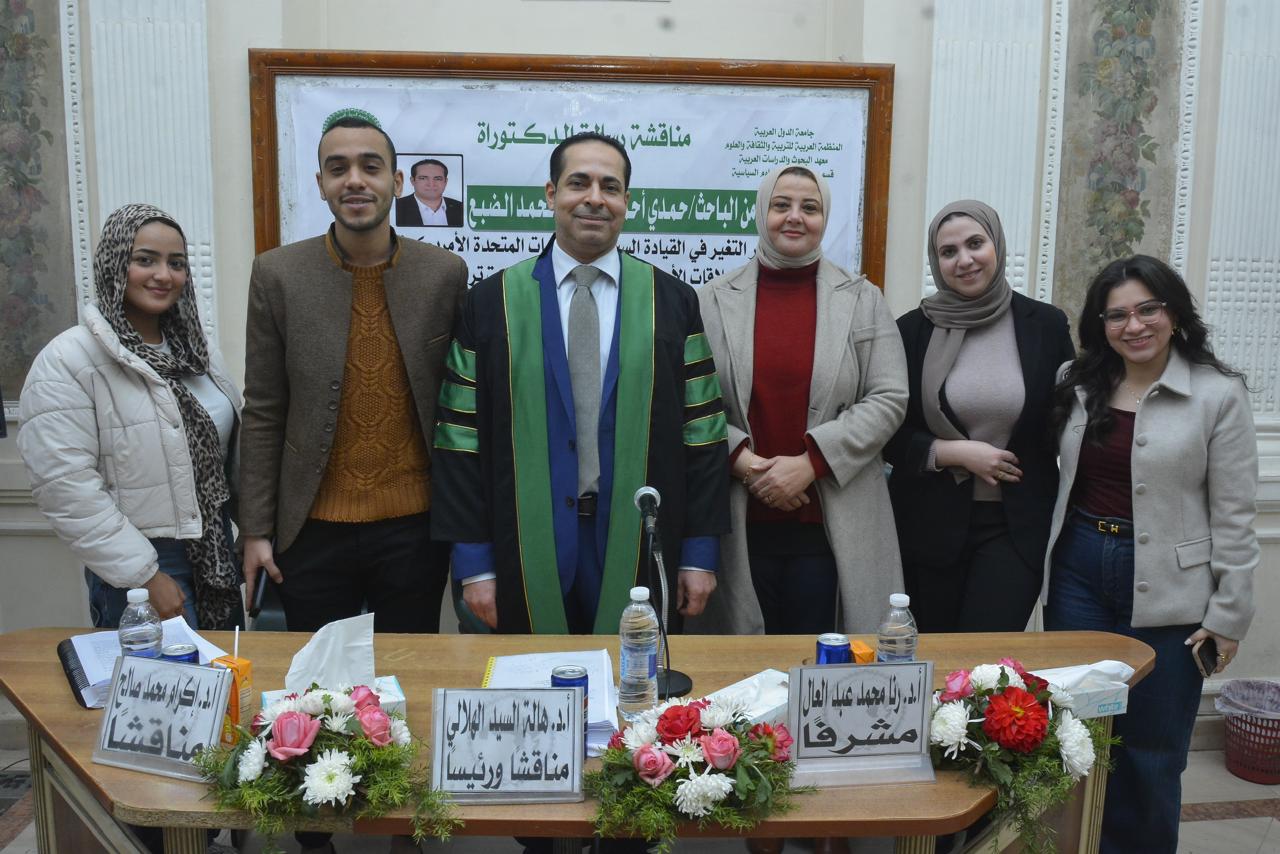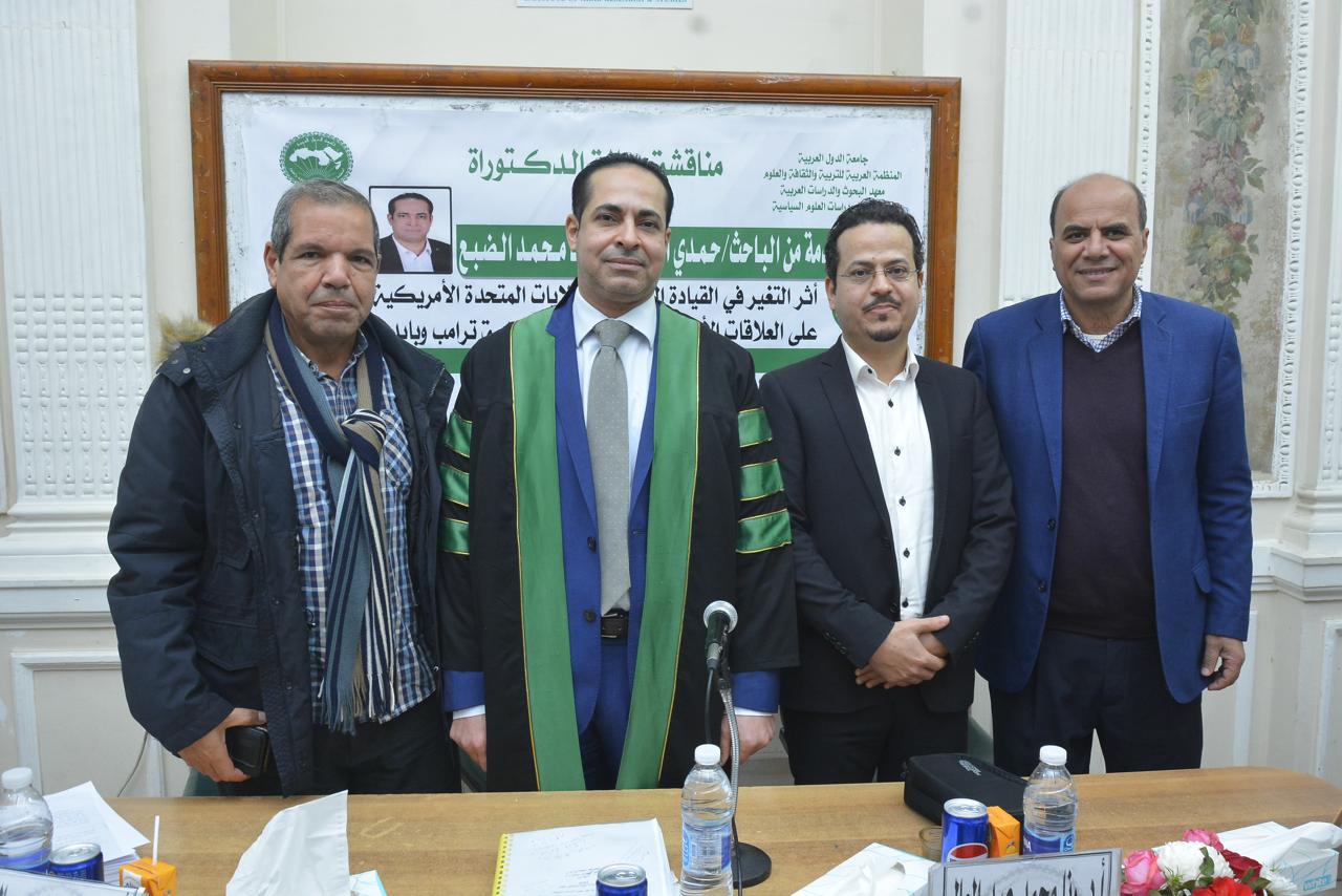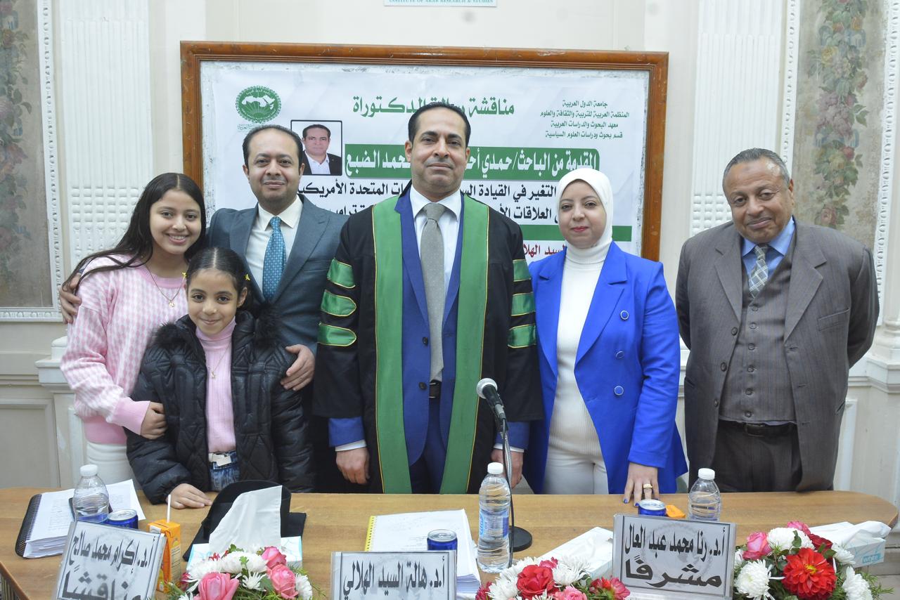 حصل الباحث حمدي أحمد أبوزيد الضبع، أمس الخميس، على درجة الدكتوراه في العلوم السياسية والعلاقات الدولية، بتقدير امتياز مع مرتبة الشرف الأولى، عن أول دراسة مقارنة في الوطن العربي بين سيكولوجية ترامب وبايدن، وذلك من معهد البحوث والدراسات العربية التابع للمنظمة العربية للتربية والثقافة والعلوم بجامعة الدول العربية، وجاءت رسالة الدكتوراه بعنوان "أثر التغير في القيادة السياسية للولايات المتحدة الأمريكية على العلاقات الأمريكية السعودية (دراسة ترامب وبايدن) خلال الفترة من 2017 إلى 2025.
