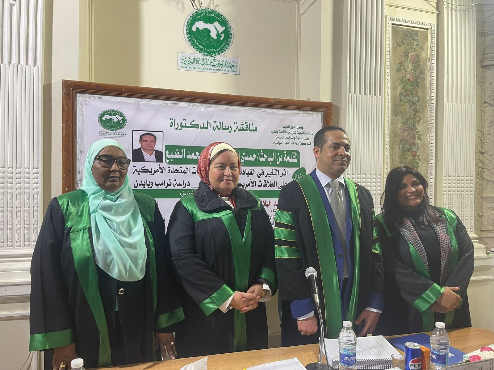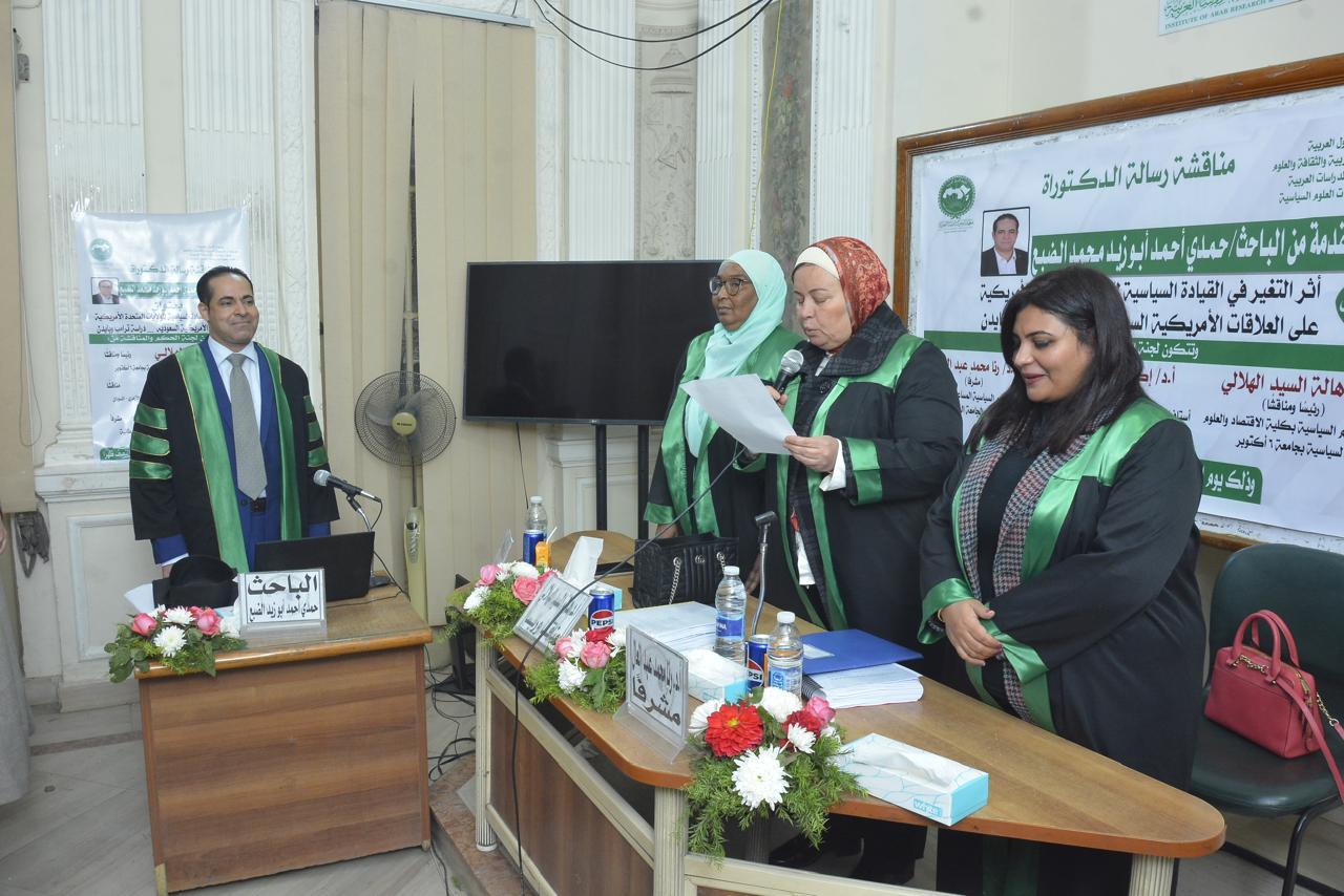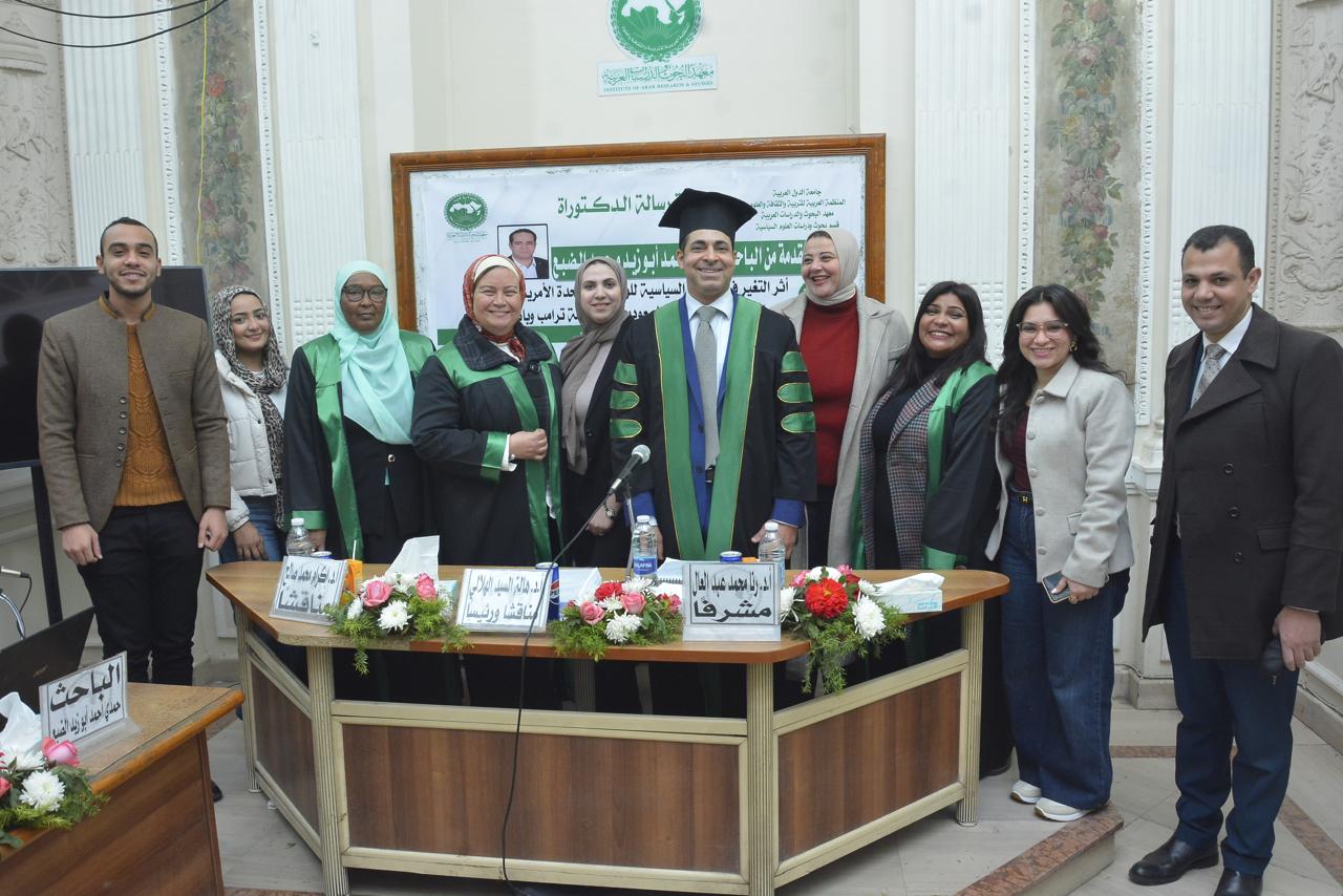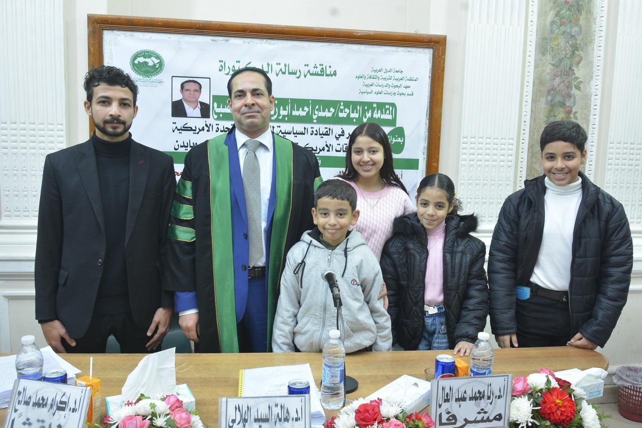 حصل الباحث حمدي أحمد أبوزيد الضبع، أمس الخميس، على درجة الدكتوراه في العلوم السياسية والعلاقات الدولية، بتقدير امتياز مع مرتبة الشرف الأولى، عن أول دراسة مقارنة في الوطن العربي بين سيكولوجية ترامب وبايدن، وذلك من معهد البحوث والدراسات العربية التابع للمنظمة العربية للتربية والثقافة والعلوم بجامعة الدول العربية، وجاءت رسالة الدكتوراه بعنوان "أثر التغير في القيادة السياسية للولايات المتحدة الأمريكية على العلاقات الأمريكية السعودية (دراسة ترامب وبايدن) خلال الفترة من 2017 إلى 2025.
