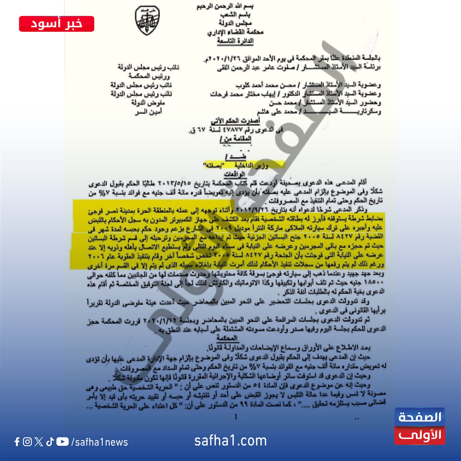 ألزم حكم محكمة القضاء الإداري في مجلس الدولة، وزير الداخلية، بصفته بدفع تعويض 100 ألف جنيه لمواطن، تم القبض عليه عن طريق الخطأ، نتيجة تشابه في الأسماء دون وجود سند قانوني أو مبرر مشروع، وهو ما اعتبرته المحكمة انتهاكًا صارخًا لحرية المواطن وحقوقه الدستورية.