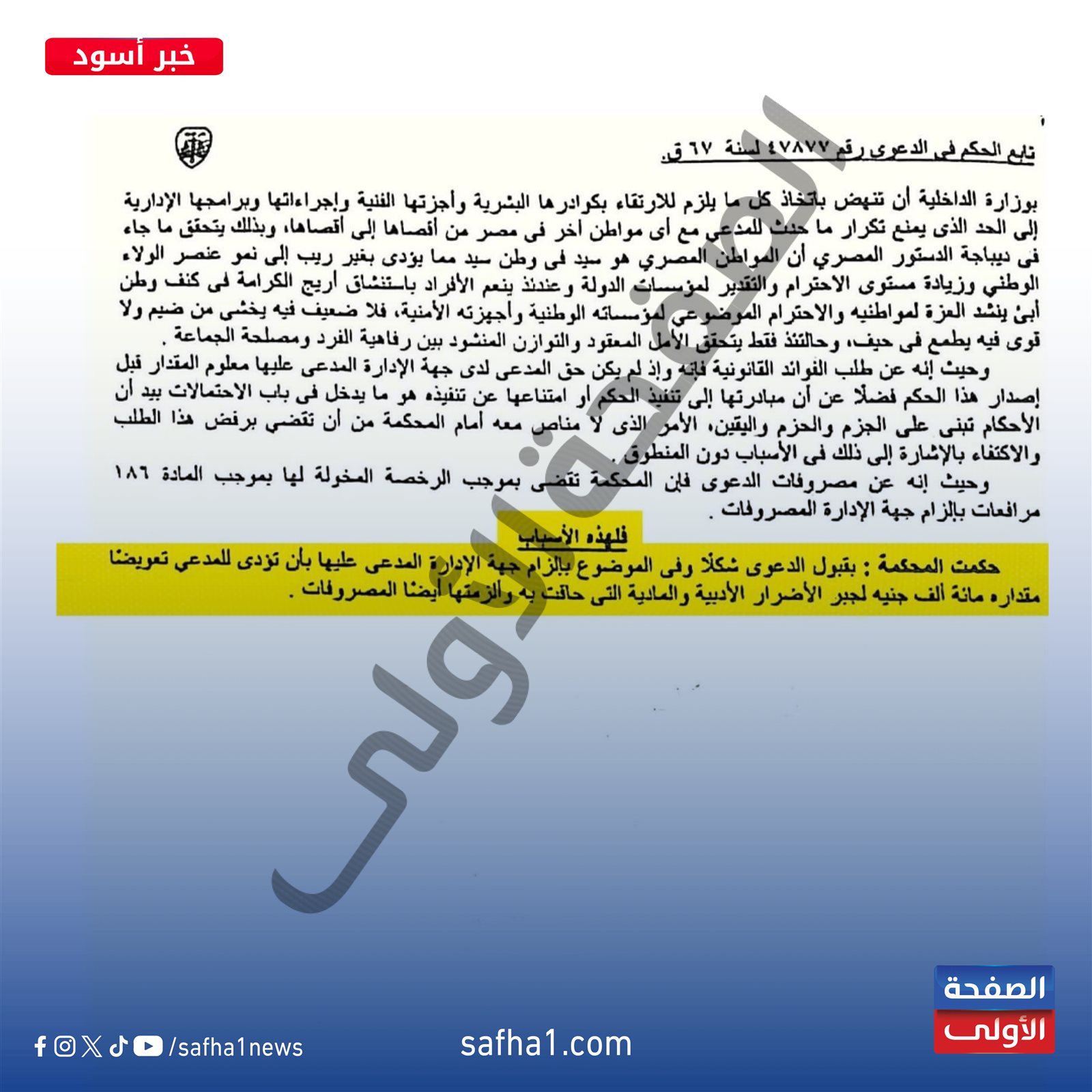 ولهذه الأسباب، حكمت محكمة القضاء الإداري بقبول الدعوى شكلا، وفي الموضوع بإلزام جهة الإدارة "وزارة الداخلية" المدعى عليها بأن تؤدي للمدعي تعويضا مقداره 100 ألف جنيه لجبر الأضرار الأدبية والمادية التي حاقت به، وألزمتها أيضا بالمصروفات.