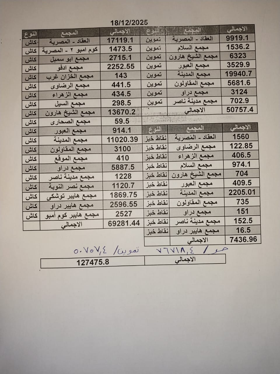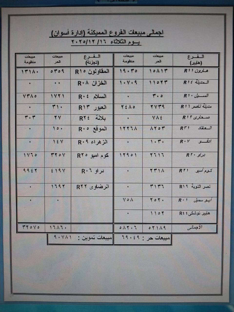 وتظهر البيانات تفوقاً واضحاً لفروع الهايبر في المساهمة بالنصيب الأكبر من الحصيلة الإجمالية، إلى جانب تحقيق الفروع المميكنة بالشركة إجمالي مبيعات يومية بلغت 90,781 جنيه كـ مبيعات تموينية، وإجمالي 69,049 جنيه كـ مبيعات حرة، وذلك فى يوم الثلاثاء 16 ديسمبر 2025.