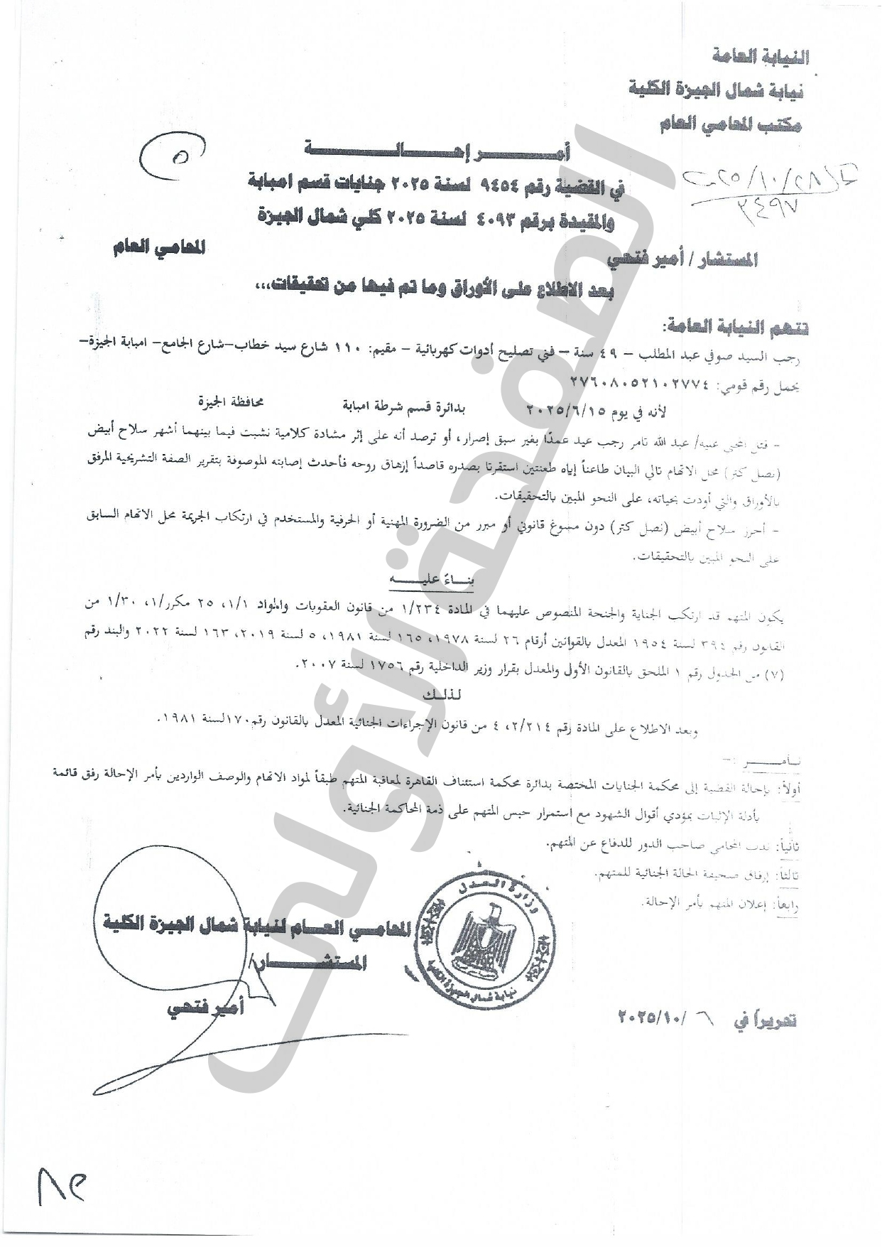 وشهدت القضية مفاجأة بعد اخلاء سبيل المتهم الثاني في القضية، وهو ابن المتهم الأول، بعد اعتراف الأب بقتل "عبد الله" منفردا، ونفي الابن اشتراكه في الجريمة، لذلك صدر أمر الإحالة في القضية رقم 9454 لسنة 2025 جنايات قسم إمبابة والمقيدة برقم 4093 كلي شمال الجيزة، باتهام "ر. ا. ص. ع"، بقتل المجني عليه عبد الله تامر رجب عيد عمدا بغير سبق إصرار أو ترصد، إثر مشادة كلامية نشبت بينهما، فأشهر سلاح أبيض "نصل كتر"، وطعنه طعنتين في صدره قاصدا إزهاق روحه.