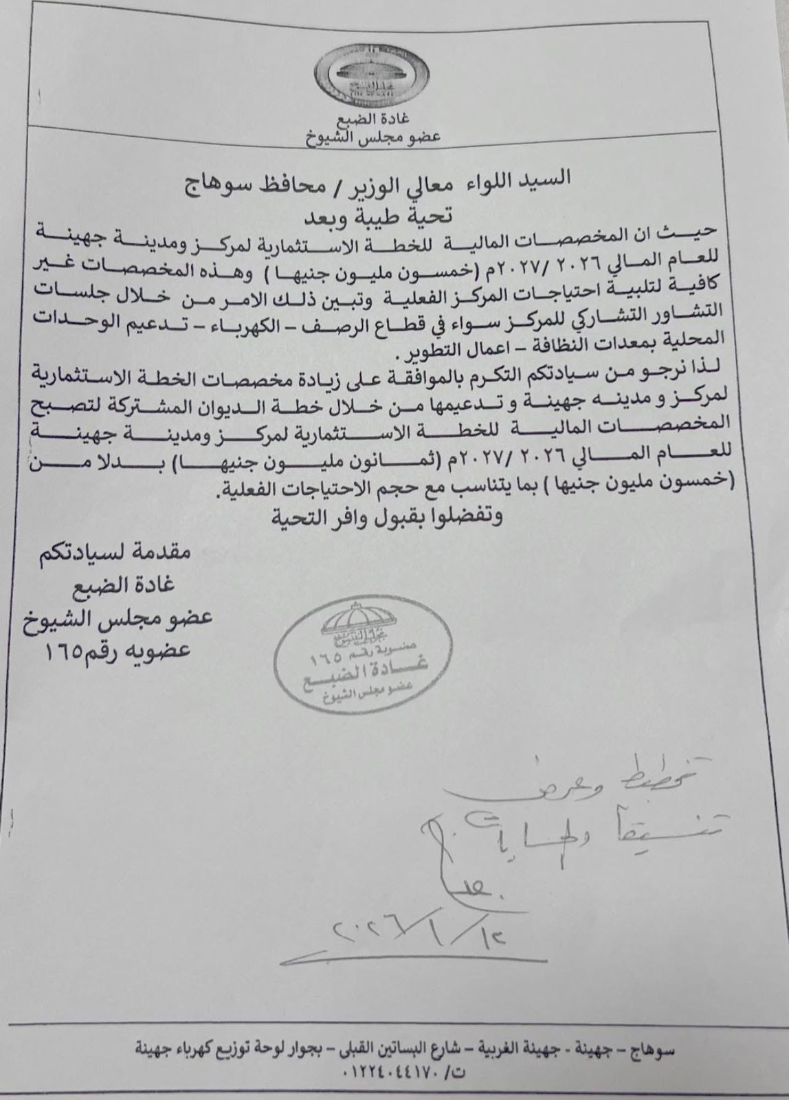وقالت عضو مجلس الشيوخ في الطلب الذي قدمته إلى اللواء دكتور عبد الفتاح سراج، محافظ سوهاج، إن المخصصات المالية للخطة الاستثمارية لمركز ومدينة جهينة 50 مليون جنيها، وهي غير كافية لتلبية احتياجات المركز الفعلية، وتبين ذلك من خلال جلسات التشاور التشاركي للمركز سواء في قطاع الرصف أو الكهرباء أو تدعيم الوحدات المحلية بمعدات النظافة وأعمال التطوير.