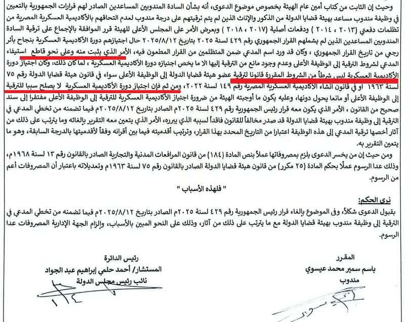 وأكدت هيئة المفوضين في مجلس الدولة، أن ضرورة اجتياز الأكاديمية العسكرية للترقية إلى الوظيفة الأعلى، يفتقر إلى سند صحيح من القانون، الأمر الذي يكون معه قرار رئيس الجمهورية رقم 429 لسنة 2025، فيما تضمنه من تخطي المدعي في الترقية إلى وظيفة مندوب بهيئة قضايا الدولة، قد صدر مخالفاً للقانون، فاقدا لسببه الذي يبرره، الأمر الذي يتعين معه التقرير بإلغائه وما يترتب على ذلك من آثار، أخصها ترقية المدعي إلى هذه الوظيفة اعتبارا من التاريخ المحدد بهذا القرار، وترتيب أقدميته فيما بين أقرانه وفقا لأقدميتها بالدرجة السابقة، وهو ما يتعين التقرير به.