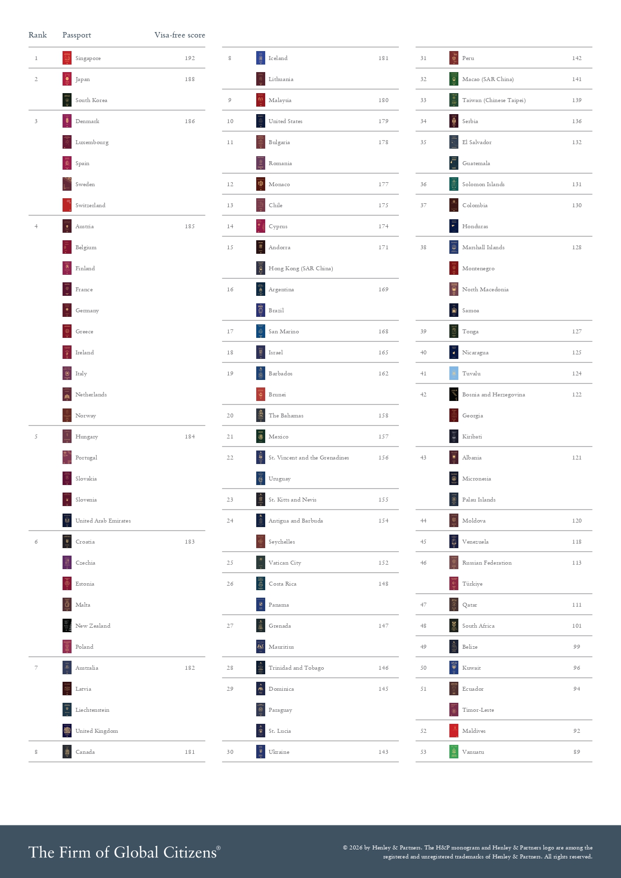 وواصلت سنغافورة تصدرها تصنيف 2026 لقوة جواز السفر العالمي، حيث يتيه جواز سفرها إمكانية الدخول دون تأشيرة إلى 192 وجهة حول العالم، بعدما حققت المركز الأول عام 2025 أيضا، وبعدها تأتي اليابان وكوريا الجنوبية في المركز الثاني، حيث يتيح باسبور كل منهما إمكانية دخول 188 دولة دون تأشيرة، وذلك بسبب علاقات طوكيو وسيول العالمية والمتشعبة، وتصنيفهما ضمن القوى السياحية والتكنولوجية الكبرى.