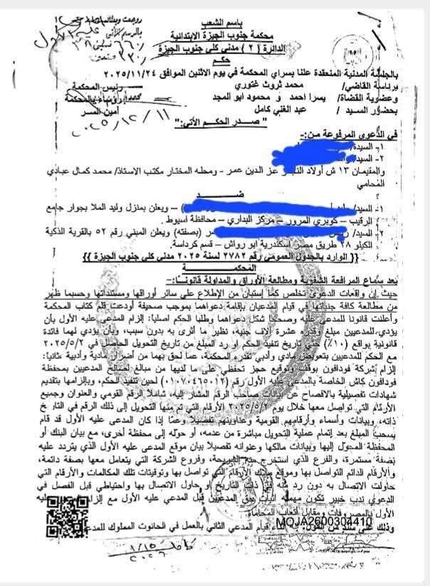 أكدت محكمة جنوب الجيزة الابتدائية، في الحكم رقم 2782 لسنة 2025، مدني كلي جنوب الجيزة، الصادر بتاريخ 24 نوفمبر 2025، مبدأ قضائيا حاسما، وهو أن تحويل مبلغ مالي عبر محفظة إلكترونية “فودافون كاش” دون حق قانوني يوجب الرد والتعويض، عملا بقاعدة الإثراء بغير سبب التي نص عليها القانون المدني.