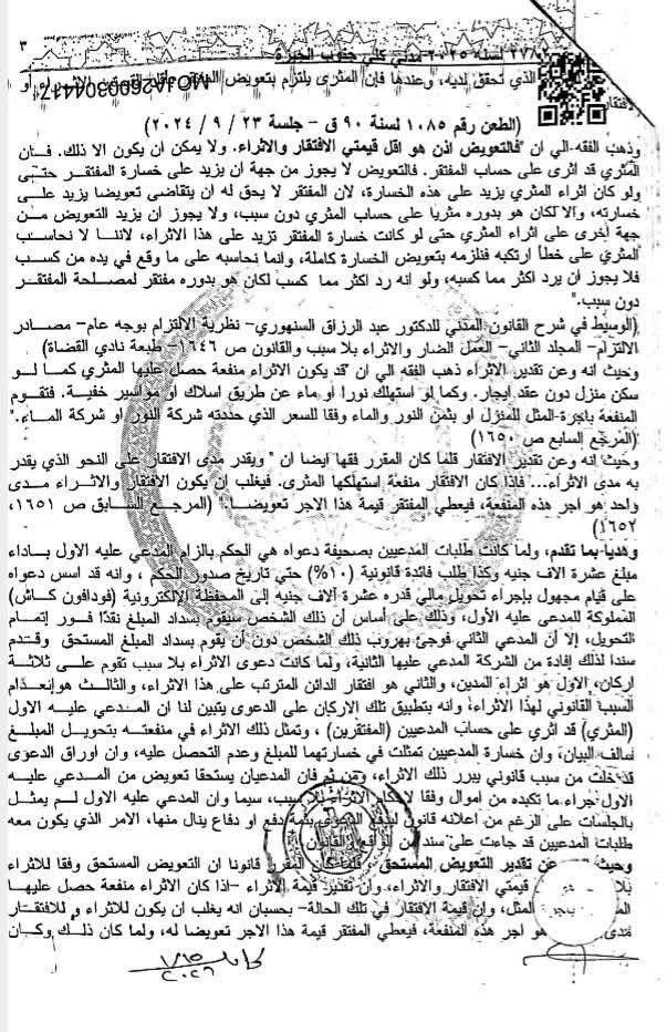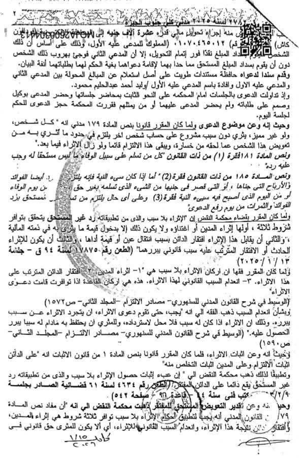 وقالت المحكمة في أسباب حكمها، إن قيام دعوى الإثراء بلا سبب يقتضي توافر ثلاثة أركان مجتمعة، وهي: إثراء المدين، وافتقار الدائن نتيجة هذا الإثراء، وانعدام السبب القانوني الذي يبرره، كما يُقدَّر التعويض المستحق بأقل القيمتين بين مقدار الإثراء ومقدار الافتقار، دون تجاوز خسارة المفتقر أو كسب المثري، وأن استفادة شخص من تحويل مالي عبر محفظة إلكترونية دون مسوغ قانوني يُعد إثراء بلا سبب يوجب الرد والتعويض.