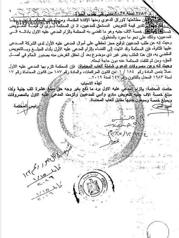 ولكل هذه الأسباب والحيثيات، حكمت المحكمة بإلزام المدعى عليه الأول برد مبلغ 10 آلاف جنيه للمدعيين، وإلزامه بأداء مبلغ 5 آلاف جنيه تعويضًا ماديًا وأدبيًا، وإلزامه بالمصروفات، ومبلغ 75 جنيهًا مقابل أتعاب المحاماة، ورفض ما عدا ذلك من طلبات.