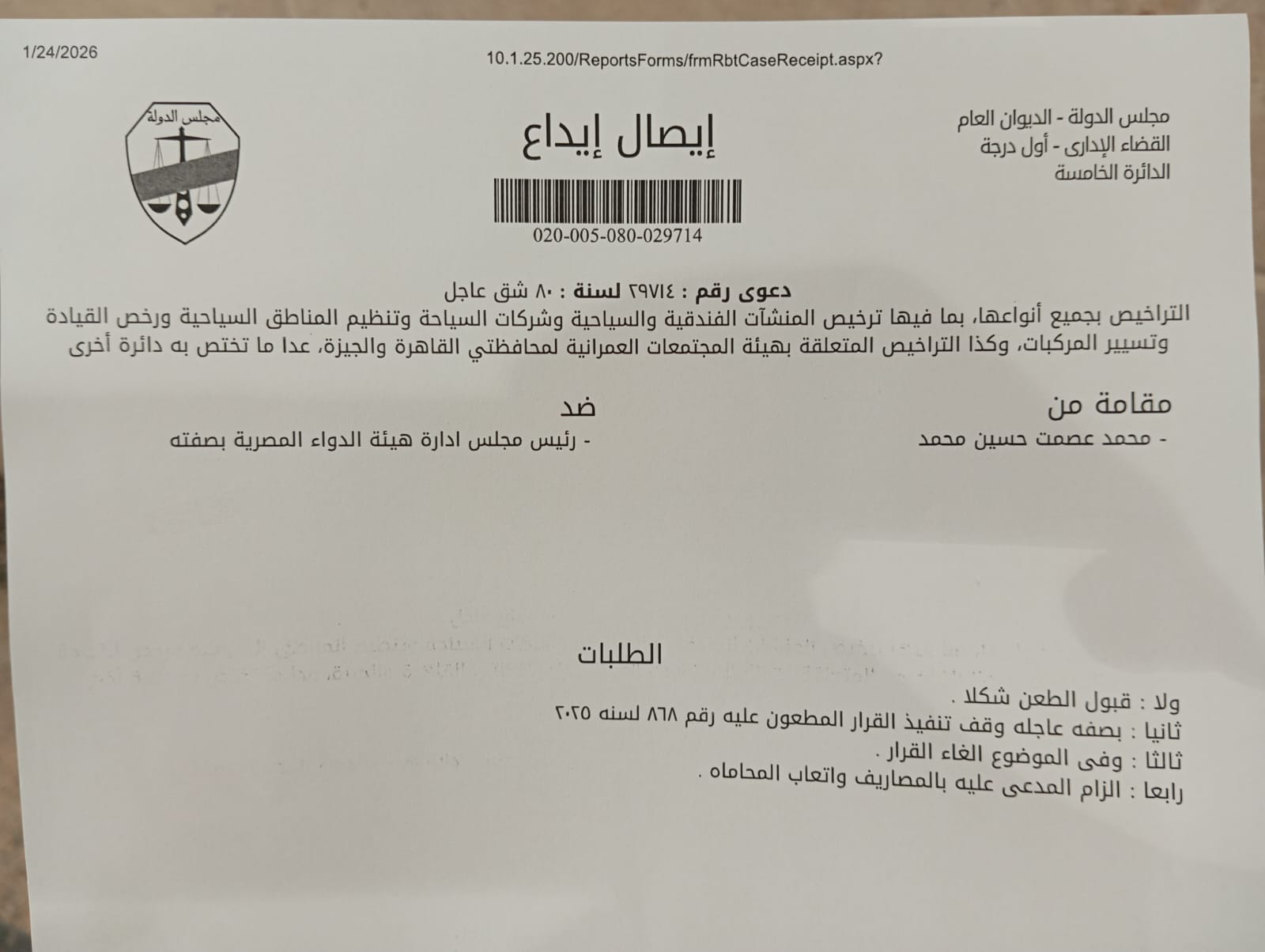 أقام الدكتور محمد عصمت حسين محمد، بصفته رئيس مجلس إدارة نادي الصيادلة في مصر، دعوى قضائية أمام محكمة القضاء الإداري بمجلس الدولة ضد رئيس مجلس إدارة هيئة الدواء المصرية، للطعن على القرار رقم (868) لسنة 2025، الخاص بالتركيبات الصيدلانية.