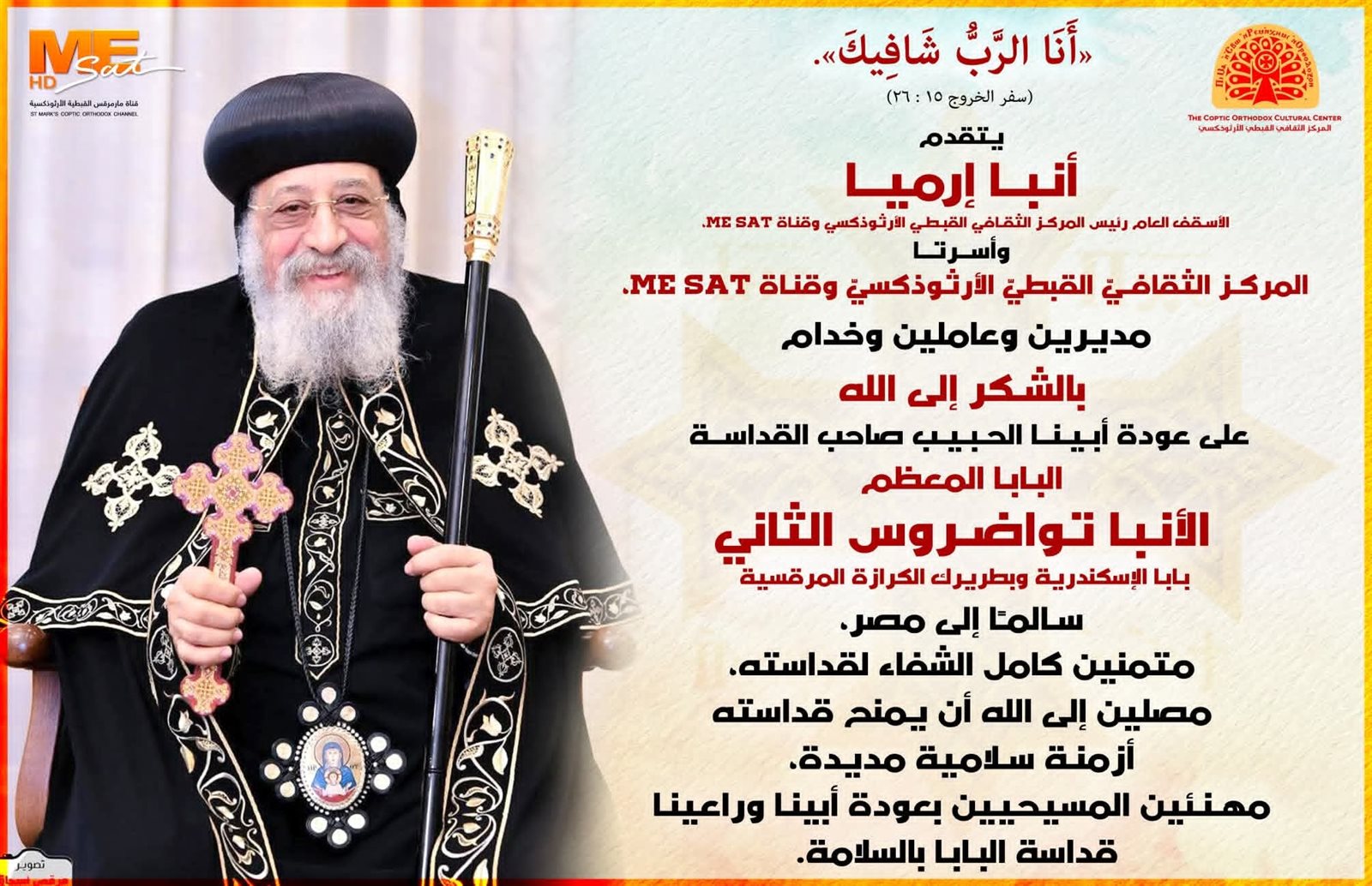 ونشرت صفحة المركز الثقافي القبطي التابع للكنيسة القبطية الأرثوذكسية، بيانا يفيد بوصول البابا تواضروس اليوم، وعودته للكاتدرائية المرقسية، ويأتى ذلك تأكيدا لخبر موعد عودة البابا، الذي انفردت به «الصفحة الأولى».