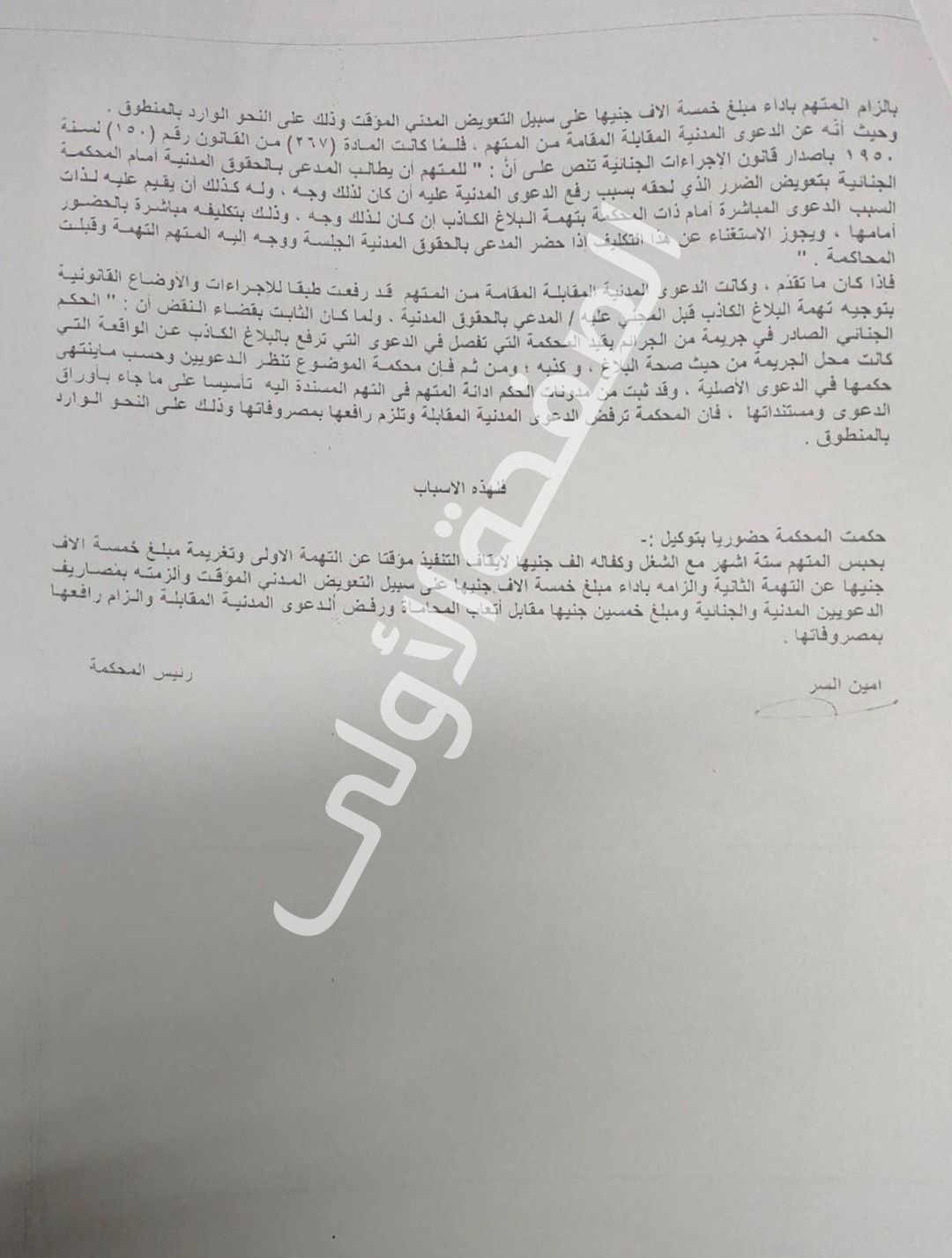 وفي النهاية، حكمت المحكمة على المستشار المتهم حضوريا بتوكيل، بحبسه ستة أشهر مع الشغل وكفالة ألف جنيه لإيقاف التنفيذ مؤقتا عن التهمة الأولى، وتغريمه مبلغ خمسة آلاف جنيه عن التهمة الثانية، وإلزامه بأداء مبلغ خمسة آلاف جنيه على سبيل التعويض المدني المؤقت، وألزمته بمصاريف الدعويين المدنية والجنائية ومبلغ خمسين جنبها مقابل اتعاب المحاماة ورفض الدعوى المدنية المقابلة وإلزام رافعها بمصروفاتها.