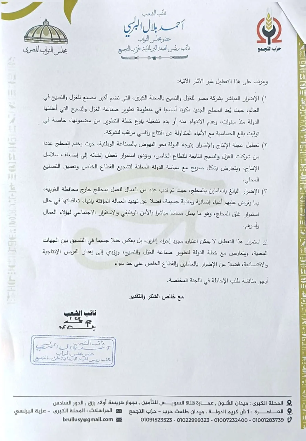 وأشار إلى الإضرار البالغ بالعاملين بالمحلج، حيث تم ندب عدد من العمال للعمل بمحالج خارج محافظة الغربية، بما يفرض عليهم أعباء إنسانية ومادية جسيمة، فضلا عن تهديد العمالة المؤقتة بإنهاء تعاقداتها في حال استمرار غلق المحلج، وهو ما يمثل مساسا مباشرا بالأمن الوظيفي والاستقرار الاجتماعي لهؤلاء العمال وأسرهم.
