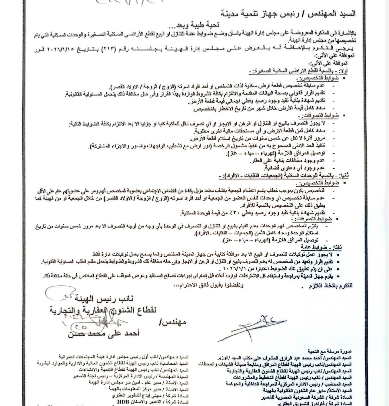 كشفت هيئة المجتمعات العمرانية عن ضوابط التنازل عن الأراضي السكنية الصغيرة والوحدات السكنية، والتي يتم تطبيقها اعتباراً من أول يناير 2026، وذلك بعد أن أرسلت الهيئة خطاباً رسمياً إلى المدن، قالت فيه إن قرار مجلس إدارة هيئة المجتمعات العمرانية الجديدة الصادر بجلسته رقم 213 والمنعقدة بتاريخ 15 / 1 / 2026، بشأن تنظيم التنازلات عن الأراضي السكنية الصغيرة والوحدات السكنية، يقتصر تطبيقه على الأراضي أو الوحدات السكنية التي تم تخصيصها بالأمر المباشر من مجلس إدارة الهيئة للجمعيات والنقابات والأفراد، ولا يسري على قطع الأراضي التي سبق تخصيصها عن طريق القرعة أو الحجز الإلكتروني ONLINE بنظام أسبقية الحجز أو المزادات والمزايدات أو أي صور تخصيص أخرى بخلاف قرارات مجلس إدارة الهيئة.