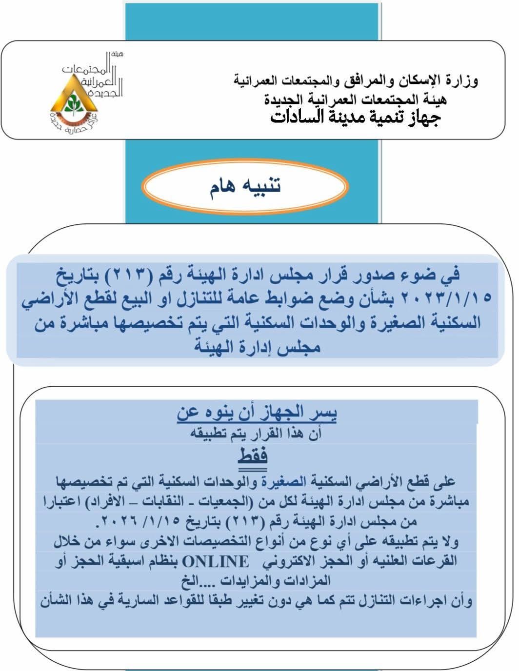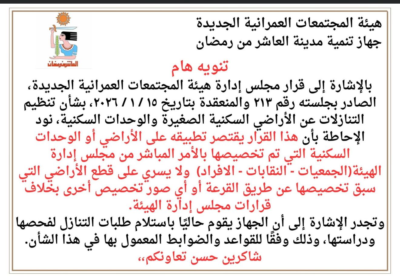 وأكدت أجهزة المدن الجديدة أنها تستلم حالياً طلبات التنازل لفحصها ودراستها، وذلك وفقاً للقواعد والضوابط المعمول بها في هذا الشأن.
