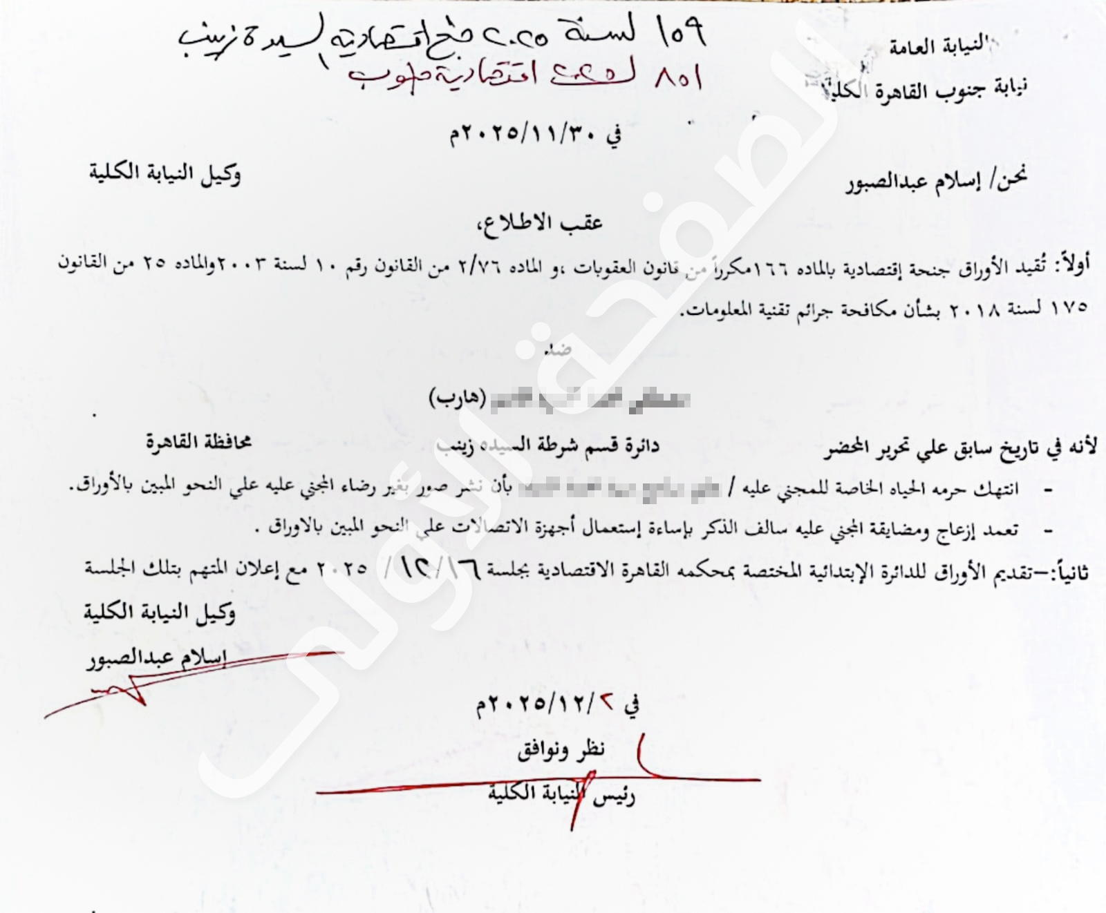 وكان أمر الإحالة في القضية رقم 159 لسنة 2025 جنح اقتصادية السيدة زينب، والمقيدة برقم 851 لسنة 2025 اقتصادية جنوب، قد اتهم "م. م. م. ق"، هارب، بانتهاك حرمة الحياة الخاصة للمجني عليه هاني سامح بأن نشر صور بغير رضاء المجني عليه، وتعمد إزعاج ومضايقة المجني عليه بإساءة استعمال أجهزة الاتصالات، وقررت نيابة جنوب القاهرة الكلية، إحالة أوراق القضية إلى الدائرة الابتدائية المختصة بمحكمة القاهرة الاقتصادية.