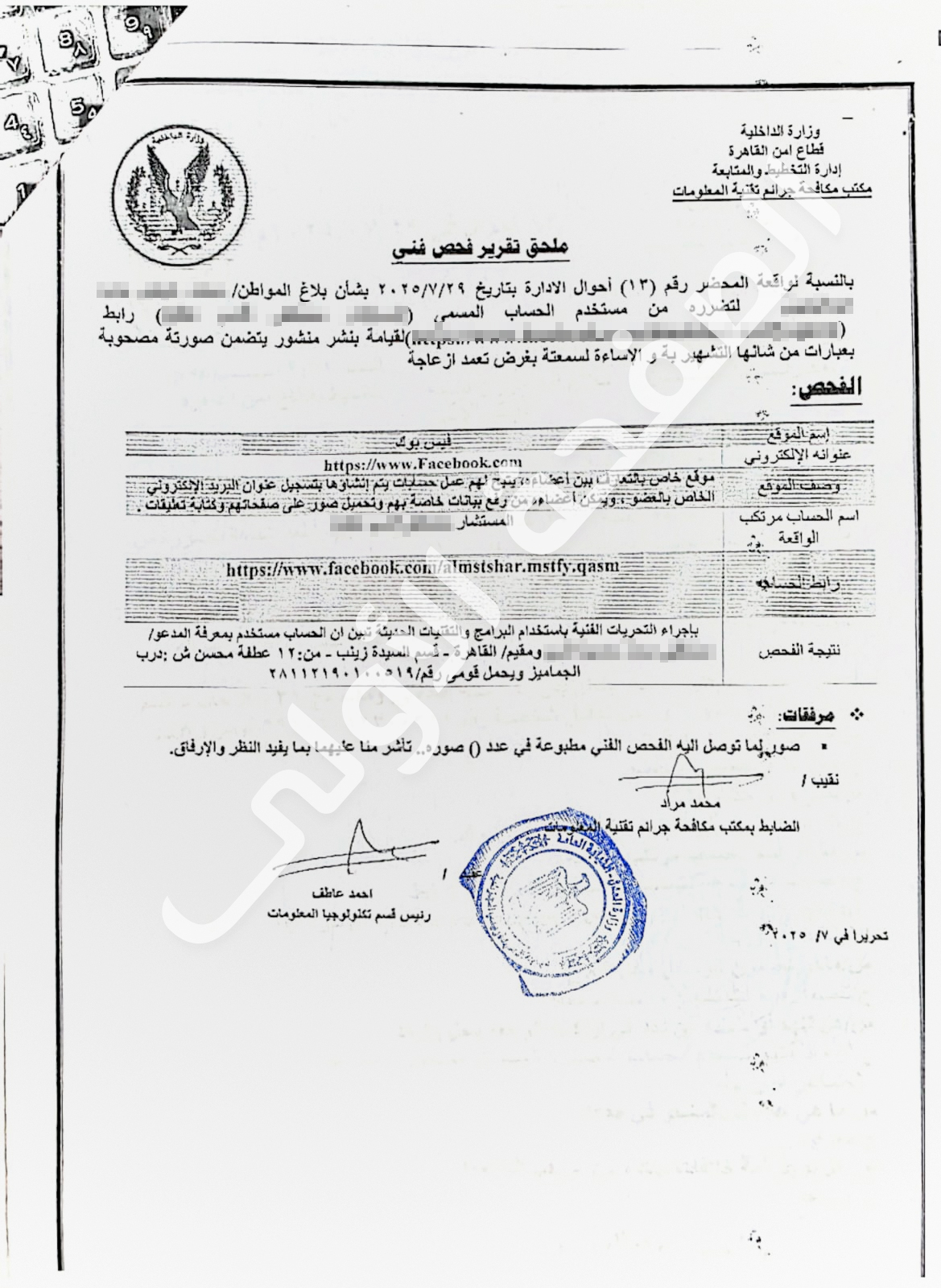 كما كشف تقرير الفحص الفني، الذي أجراه مكتب مكافحة جرائم تقنية المعلومات بقطاع أمن القاهرة، أثبت الضرر من الصفحة المسماة المستشار "م. ق. ع"، والتي يديرها "م. م. م. ق"، والمقيم في القاهرة قسم السيدة زينب، بعدما نشر منشورا يتضمن صورا مصحوبة بعبارات من شانها التشهير والإساءة للسمعة بغرض تعمد الإزعاج.