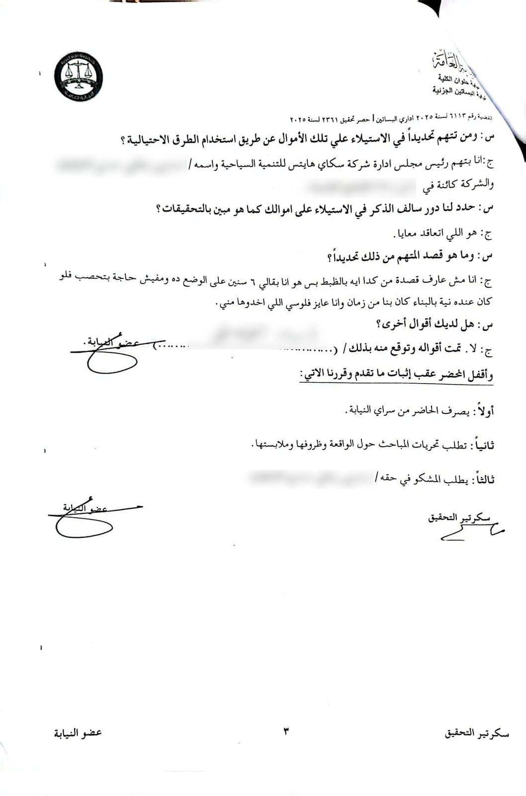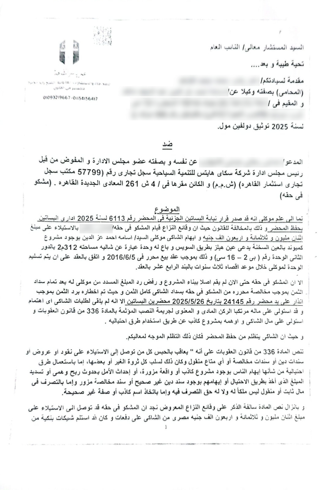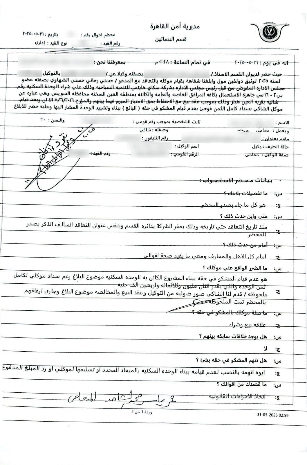 وحرر عمر ياسر الشاهد محامي المجني عليه ، المحضر الذي حمل رقم 6113 لسنة 2025 ادارى البساتين، اتهم فيه رجل الأعمال رئيس مجلس ادارة شركة سكاى هايتس بالنصب على موكله فى مبلغ اثنان مليون و ثلاثمائة وأربعون الف جنيه، بأن أوهمه بمشروع كاذب و هو الوحدة السكنية ( الشاليه) و الذى لم يتم بناءه حتى الان بعد مرور عشر سنوات منذ تاريخ التعاقد فى 2016.