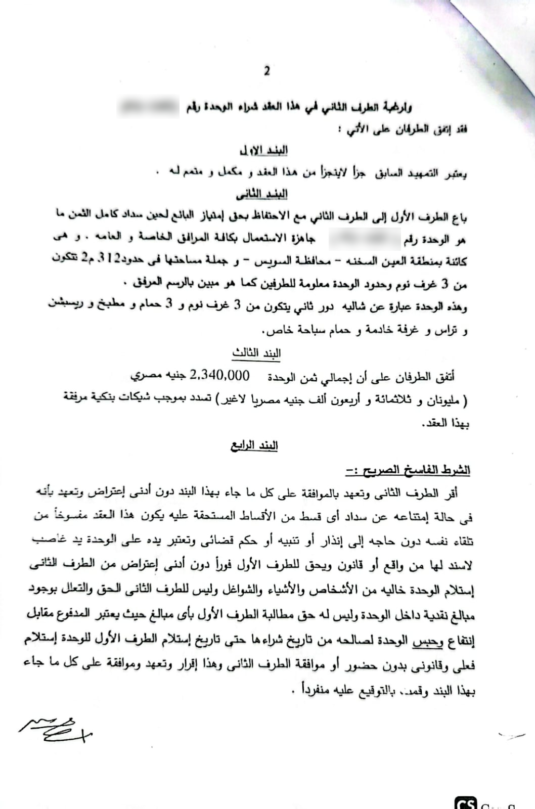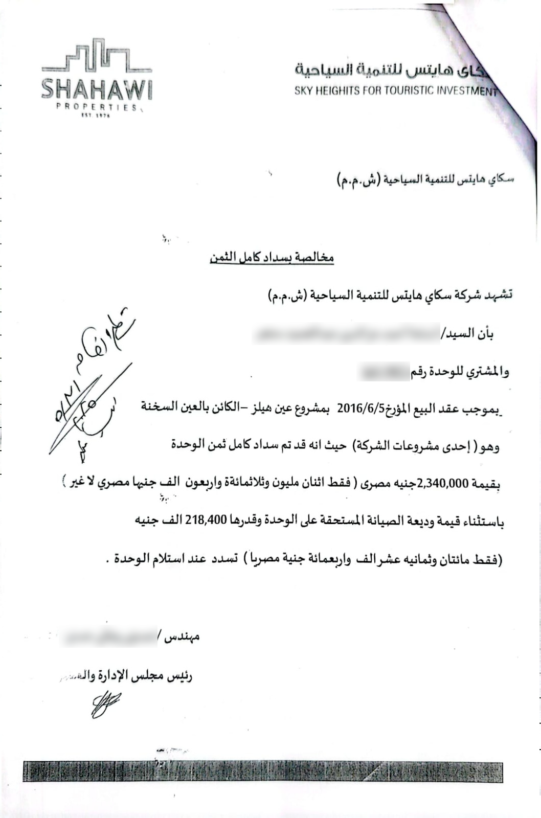 وكان المجني عليه ، اشترى الوحدة رقم P2-16C بموجب عقد البيع المؤرخ في 5 يونيو 2016، في مشروع عين هيلز في العين السخنة، وتم سداد كامل ثمن الوحدة وقدره 2 مليون و340 ألف جنيه، وبالفعل حصل على مخالصة من الشركة موقع عليها من المتهم حسني رجائي.