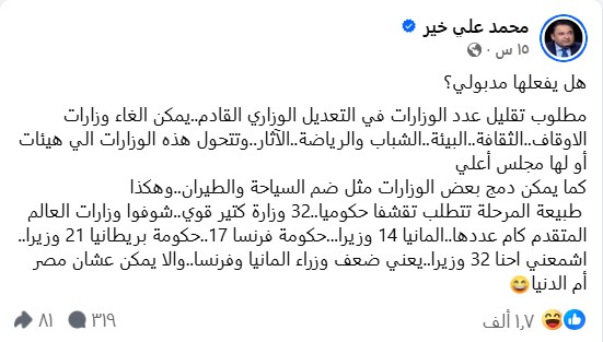 وانتقد الإعلامي محمد علي خير، التضخم الحكومي في الوزارات قائلا: طبيعة المرحلة تتطلب تقشفا حكوميا، 32 وزارة كتير قوي.. شوفوا وزارات العالم المتقدم: ألمانيا 14 وزيرا، فرنسا 17، بريطانيا 21 وزيرا.. اشمعنى احنا 32 وزيرا يعني ضعف وزراء ألمانيا وفرنسا ولا يمكن عشان مصر أم الدنيا.