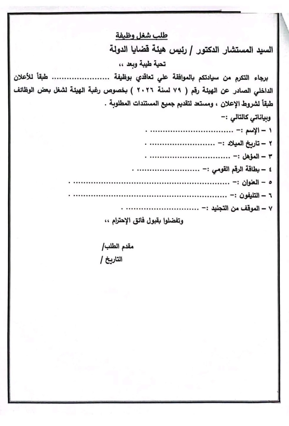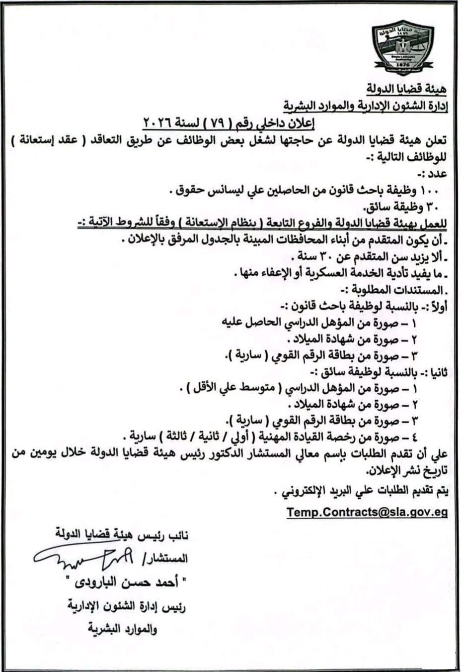 وبالنسبة لوظيفة سائق يشترط تقديم صورة المؤهل المتوسط على الأقل وصورة شهادة الميلاد وصورة بطاقة الرقم القومي السارية وصورة رخصة قيادة مهنية سارية، يتم تقديم الطلبات باسم المستشار الدكتور حسين مدكور رئيس هيئة قضايا الدولة خلال يومين من تاريخ نشر الإعلان وذلك عبر البريد الإلكتروني.