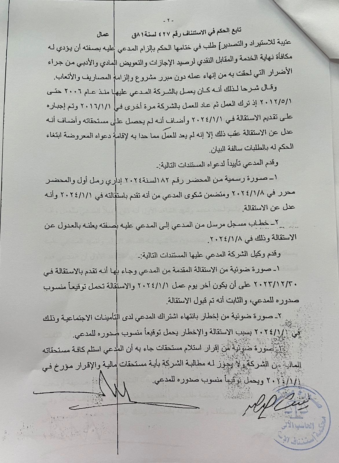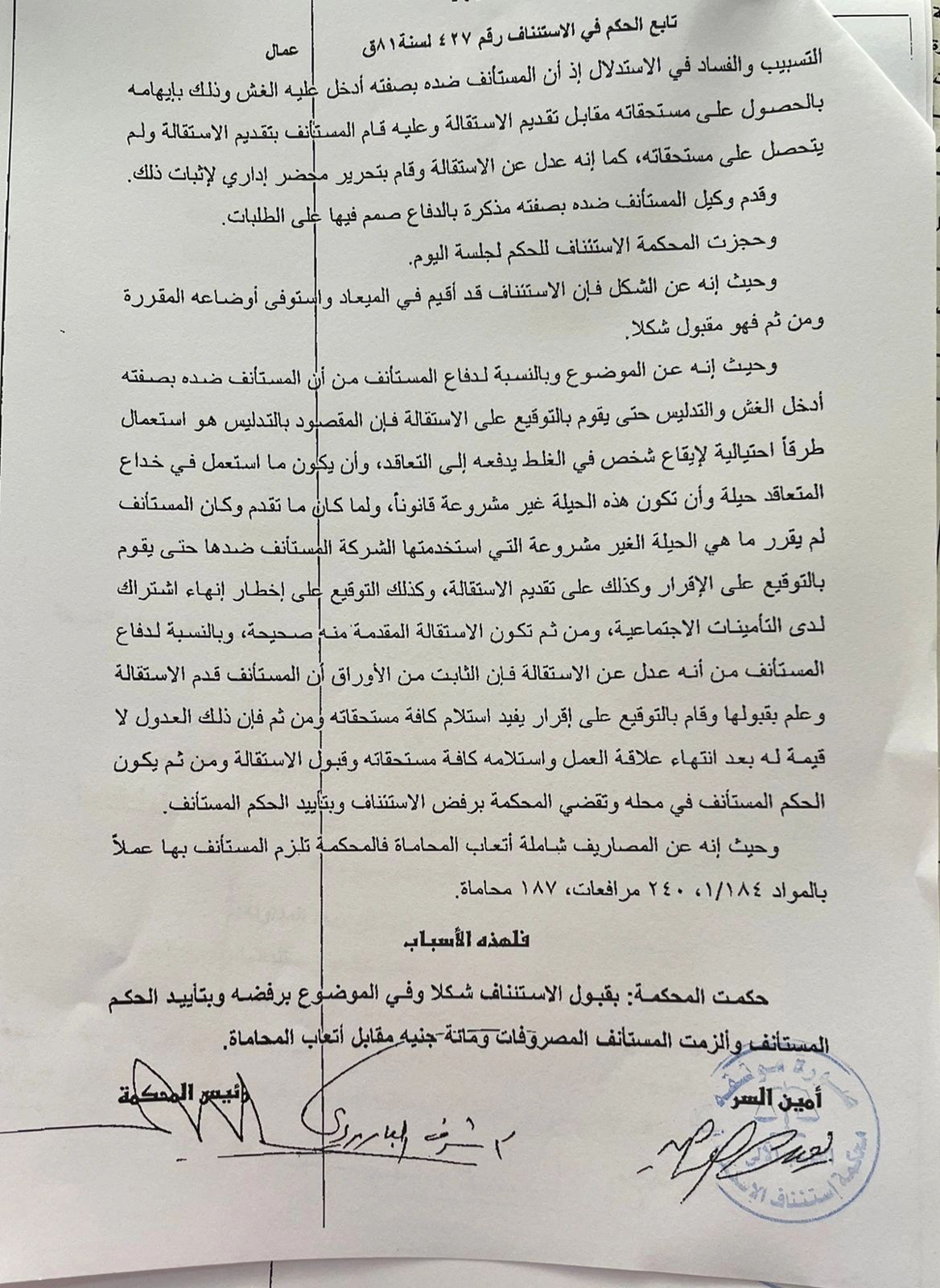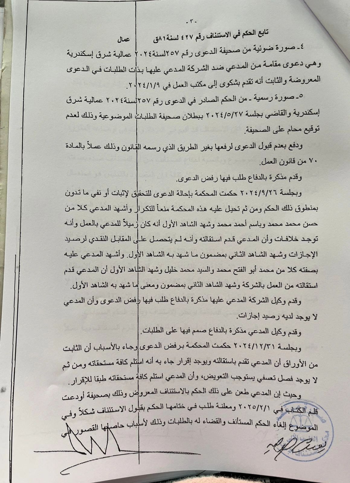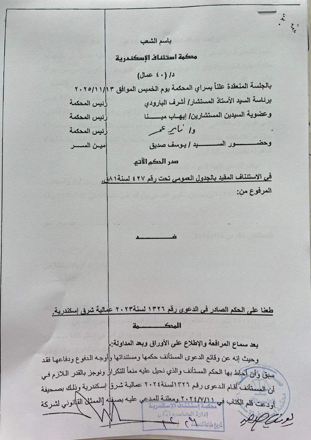 ولكن، إذا قدم العامل استقالته، واستلم مستحقاته المالية ووقع المخالصة، هل يحق له الرجوع في استقالته، قائلا: "أنا بعدل عن الاستقالة طالما المدة لم تنته، وتأتي الإجابة من واقع حكم محكمة استئناف الإسكندرية الدائرة 40 عمال، رقم 427 لسنة 81 ق، الصادر بتاريخ 13 نوفمبر 2025، في الطعن على الحكم الصادر في الدعوى رقم 1326 لسنة 2023 عمالية شرق إسكندرية، والذي أرست فيه محكمة الاستئناف مبدأ ًمهم، وهو أن "استلام المستحقات ينهي الجدل حول الاستقالة".