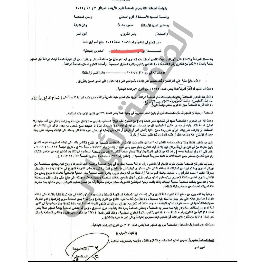 وحيث إن المحكمة تطمئن إلى ثبوت الاتهام بـ الرشوة الانتخابية، إذ استقام الدليل على صحته وثبوته في حقه، وذلك مما ورد بمحضر الشرطة المؤرخ 25 / 11 / 2025 والمحرر بمعرفة النقيب محمد الشرقاوي – ضابط مباحث قسم أول طنطا، والذي قرر أنه أثناء متابعته لسير العملية الانتخابية لاحظ تجمع عدد من الأهالي، يتوسطهم المتهم، يقوم بتوزيع مبالغ مالية وتجميع بطاقات رقم قومي، وبضبطه عُثر بحوزته على مبلغ 1700 جنيه وعدد 9 بطاقات شخصية مختلفة البيانات، بقصد توجيه المواطنين للتصويت لصالح أحد المرشحين، وهو ما تأيد بتحريات المباحث.