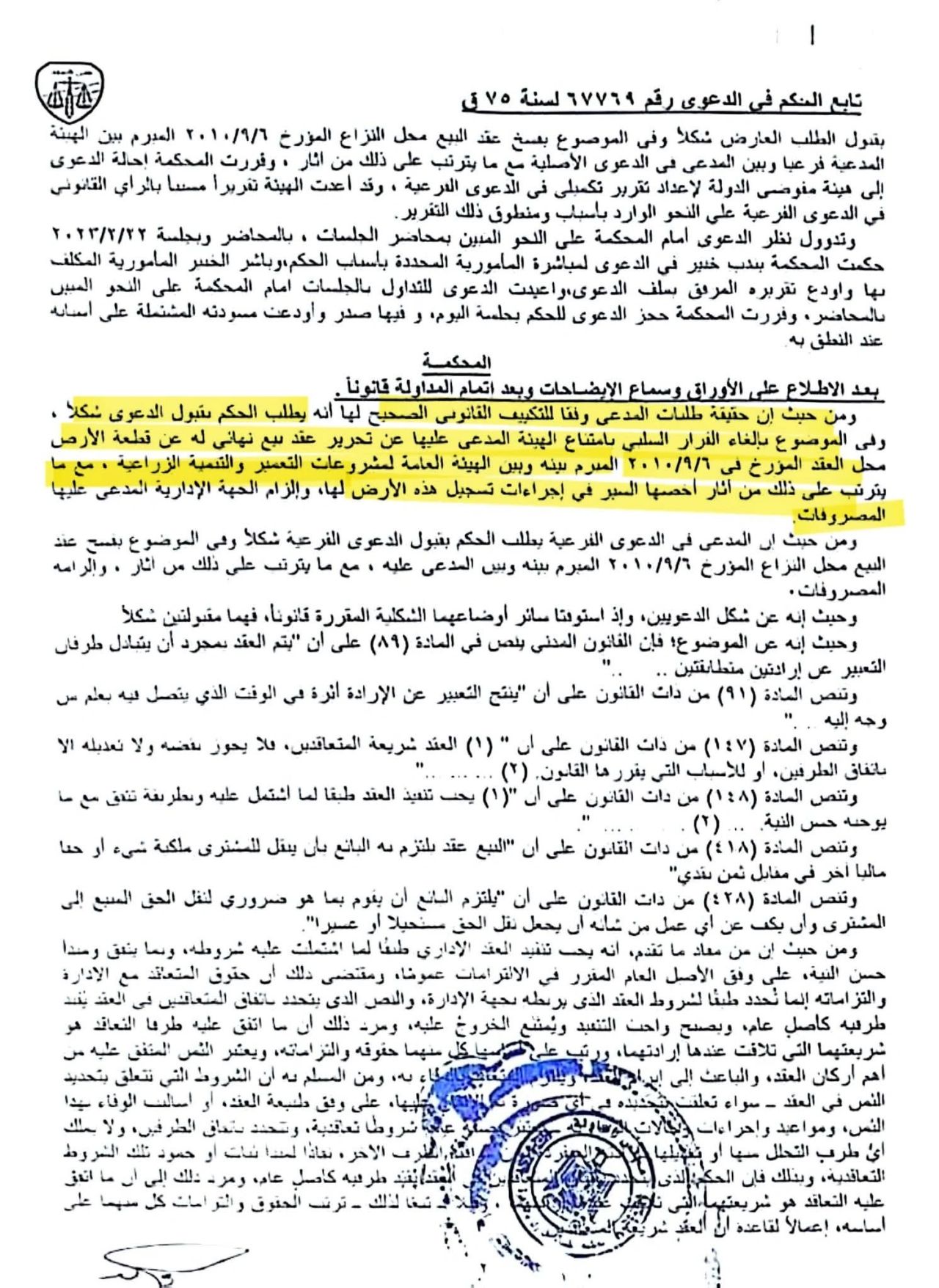 وفي النهاية حكمت محكمة القضاء الإداري في مجلس الدولة بإلغاء القرار السلبي القاضي بعدم تحرير عقد البيع النهائي، وأكدت أن العقد الإداري واجب التنفيذ وفقاً لمبدأ حسن النية، وأن الدولة ملزمة بالتقيّد بالإجراءات القانونية في كل نشاطات سلطتها، خاصة وأن هيئة التعمير لم تقدم أي مخالفة من جانب المشتري، فوجدت المحكمة أن المتعاقد أوفى بالتزاماته بما فيها الزراعة والسداد.