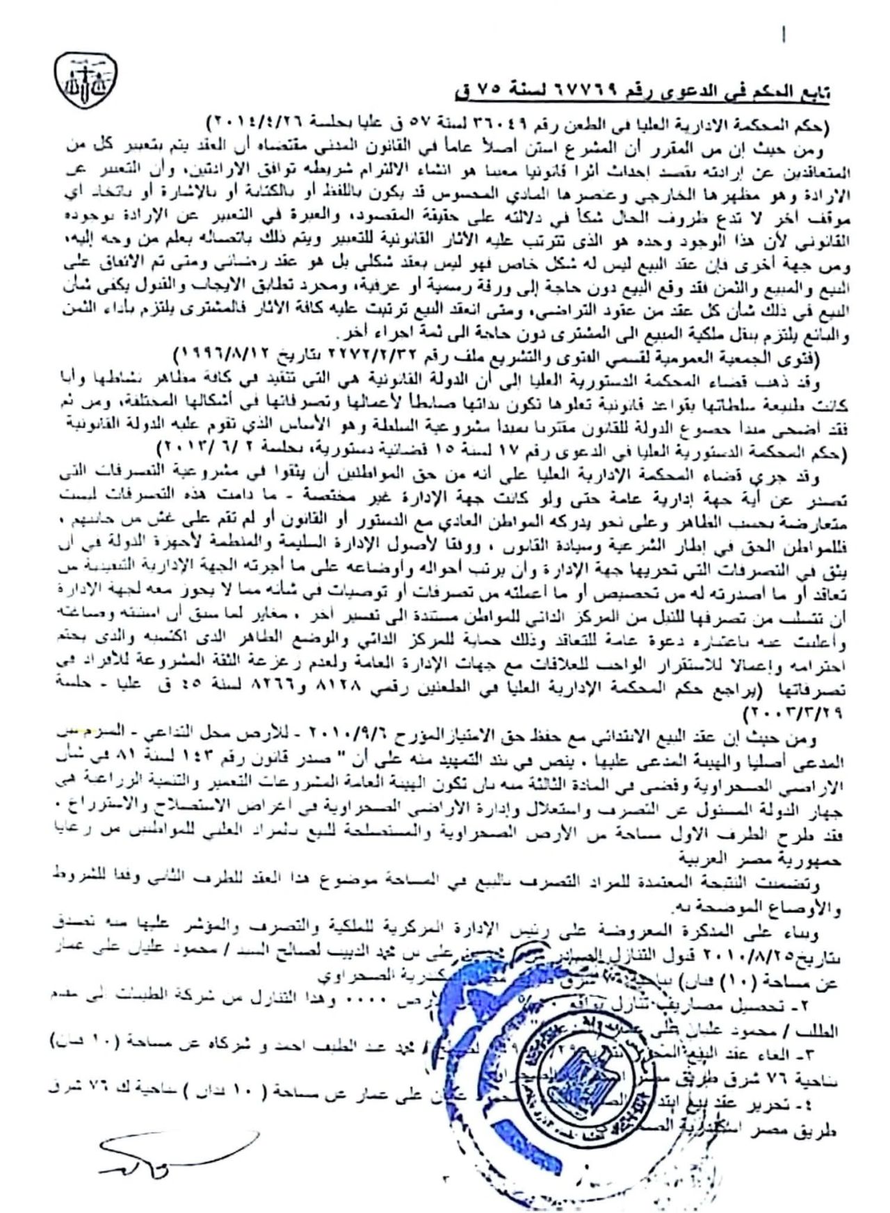 ويمثل الحكم سابقة مهمة في القضاء الإداري التابع لمجلس الدولة، لأنه يمثل قبولا لعقود البيع من جهات حكومية وتطبيقها في المحكمة الإدارية، والتي عادة ما تُعترف بها فقط في القضاء المدني، كما يترتب على الحكم آثار مهمة في ملفات قيد التسجيل، ويدعم حقوق المتعاقدين الذين وقعوا عقودا حكومية وانتظروا تسجيلها.