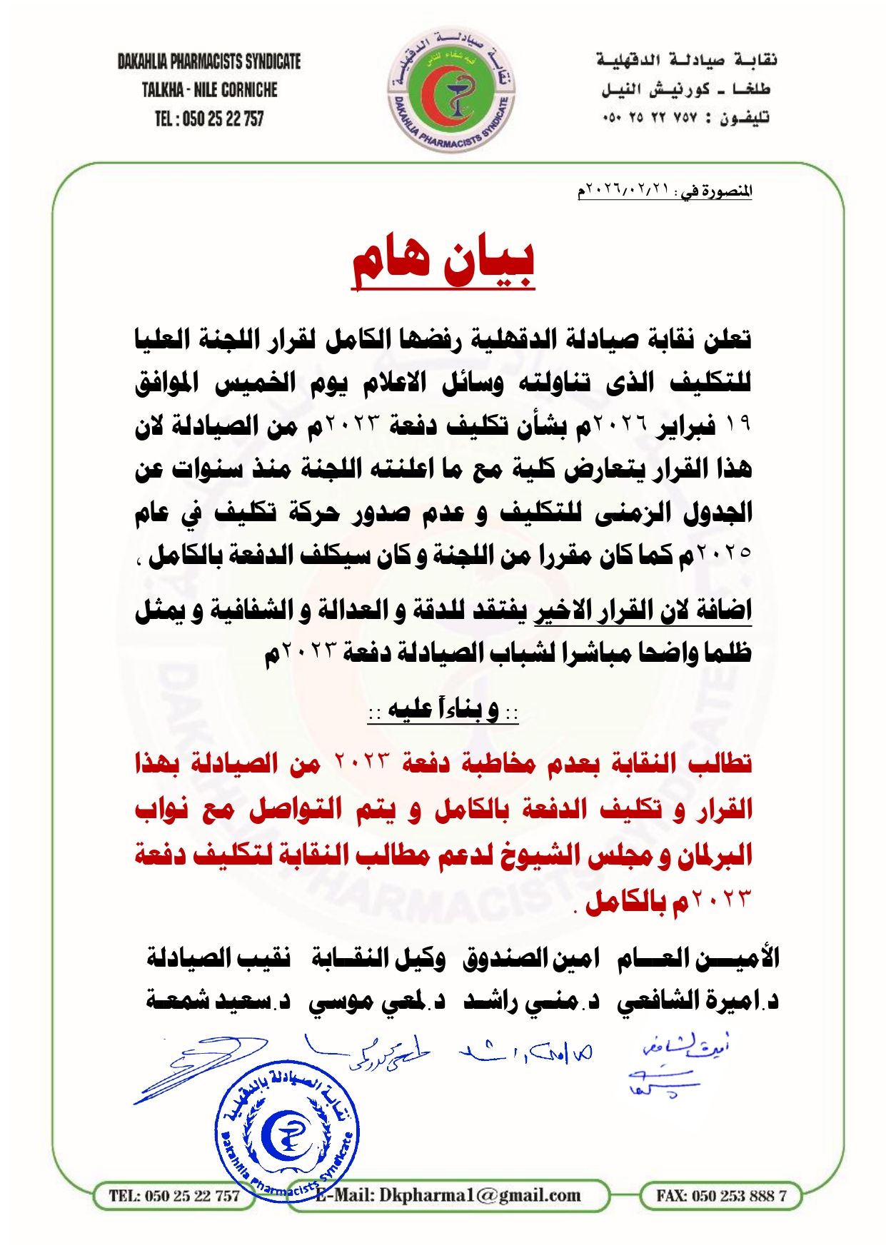 كما أعلنت نقابة صيادلة الدقهلية رفضها الكامل لقرار اللجنة العليا للتكليف بشأن تكليف دفعة 2023 من الصيادلة، لأن هذا القرار يتعارض كلية مع ما اعلنته اللجنة منذ سنوات عن الجدول الزمني للتكليف وعدم صدور حركة تكليف في عام 2025، كما كان مقررا من اللجنة وكان سيكلف الدفعة بالكامل.