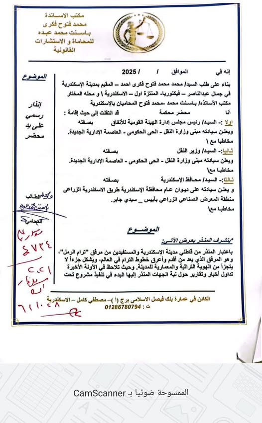 من جانبه قال محمد فتوح المحامي صاحب الدعوى القضائية أمام محكمة القضاء الإداري لإيقاف مشروع تطوير ترام الرمل بالإسكندرية، إنه حرر محضر إثبات حالة وجريمة إتلاف مال بتاريخ 21/2/2026 في قسم شرطة أول المنتزة، بشأن أعمال فك القضبان والشبكة الكهربائية بمحطات فيكتوريا والسيوف.