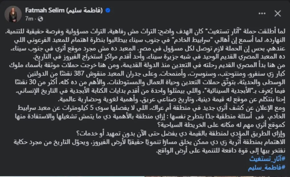 وأشارت «سليم»، في منشور لها عبر صفحتها الرسمية على موقع التواصل الاجتماعي «فيس بوك»، إلى أن مطالب أهالي منطقة سرابيط الخادم بضرورة الاهتمام بالمعبد الفرعوني هناك تعكس وعيا مجتمعيا بقيمة الموقع، مؤكدة أن المعبد ليس مجرد أثر في جنوب سيناء، بل هو المعبد المصري القديم الوحيد في شبه جزيرة سيناء، وأحد أقدم مراكز استخراج الفيروز في التاريخ.