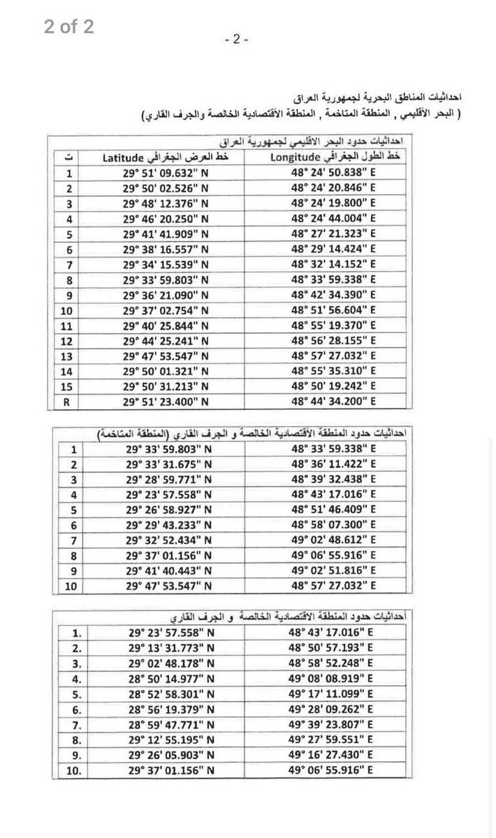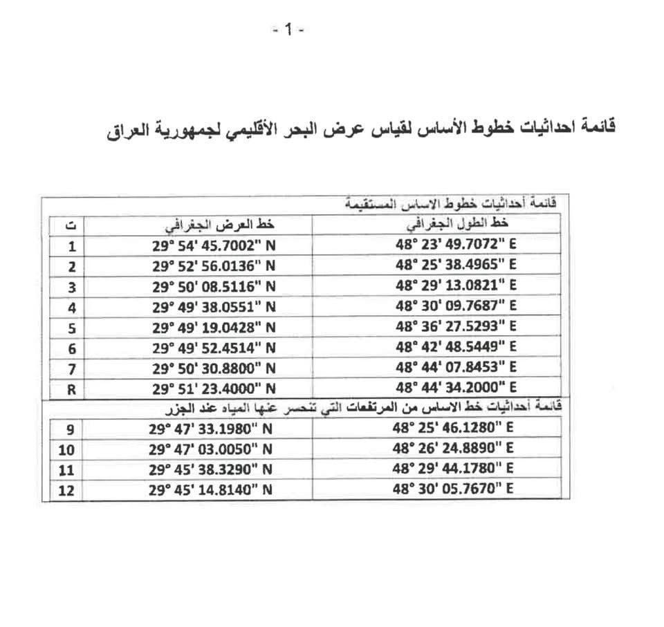 وقام العراق رسمياً بإيداع خرائطه وإحداثياته المحدثة لدى الأمين العام للأمم المتحدة لتعزيز الوضوح القانوني لمناطقه البحرية. وأكدت الحكومة العراقية أن تحديد مجالاتها البحرية شأن سيادي يستند إلى قوانين وطنية واتفاقيات دولية، ولا يحق لأي دولة التدخل فيه.