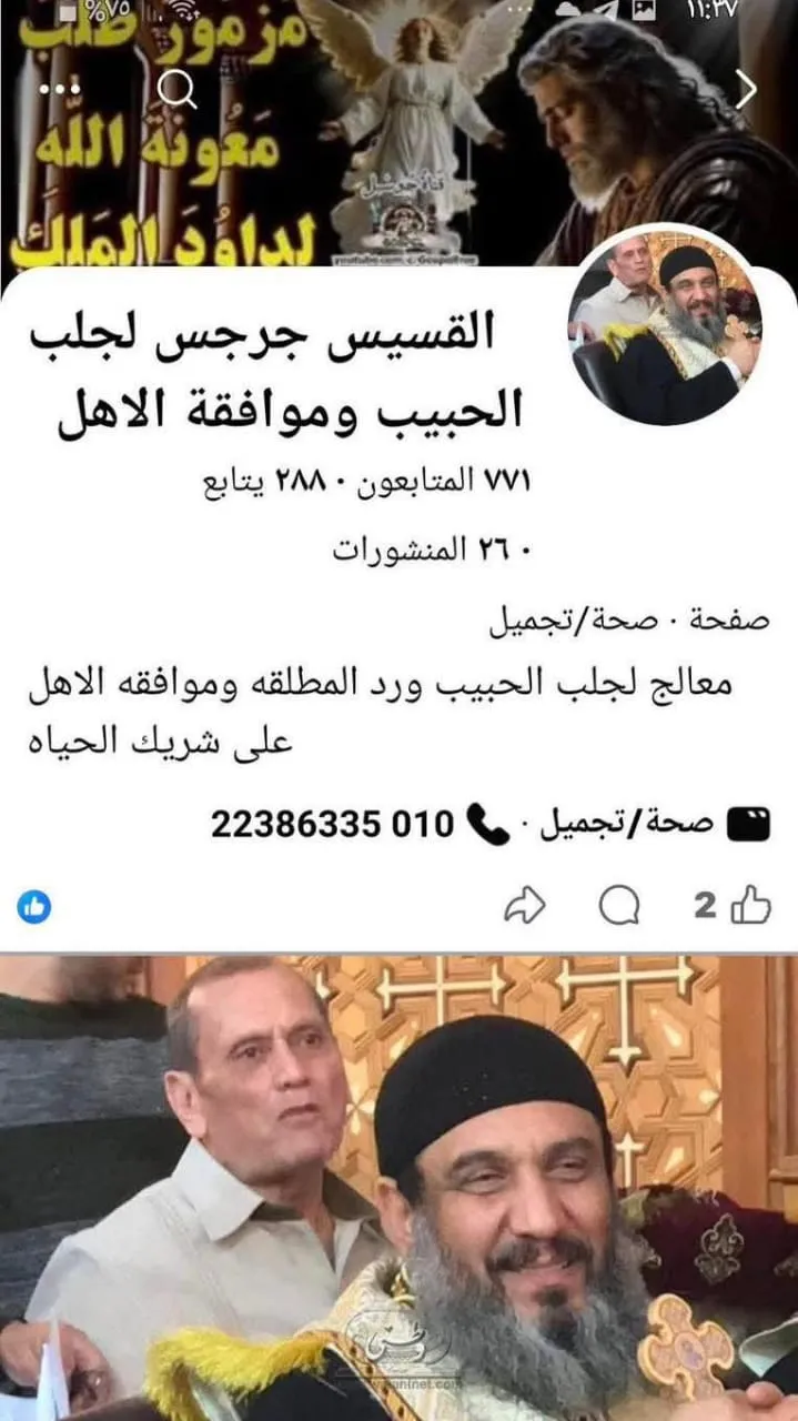 وكتب منشىء الصفحة عبارة (القسيس جرجس لجلب الحبيب وتنزيل الأموال وحل جميع المشكلات) على إعتبارها شعارا للتعريف بصفحته وتضمنت خدماته جلب الأموال (خلال ساعتين) وحل المشكلات الزوجية وموافقة الأهل على الشريك وعلاج المس والجن العاشق وتأخر الزواج والطاعة العمياء، لافتا إلى أن النتائج تكون فورية من خلال الخدام الروحانيين واللبان الدكر والزئبق الأحمر.