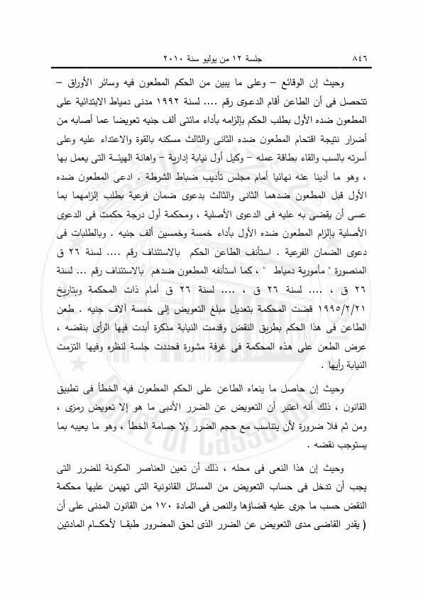 وقضت محكمة أول درجة بتعويض قدره خمسة وخمسون ألف جنيه، إلا أن محكمة الاستئناف خفضت التعويض إلى خمسة آلاف جنيه فقط، فطعن المدعي على هذا الحكم بطريق النقض، لتقرر المحكمة العليا نقض الحكم.