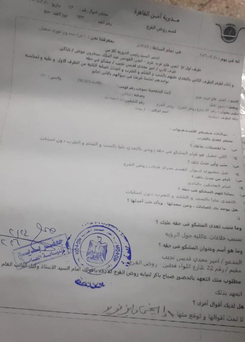 حررت إ - ف محضر رقم ٢١٢٤ لسنة٢٠٢٦(جنح روض الفرج) ضد زوجها أ - م واتهمته خلاله بـالاعتداء عليها بالسب والضرب خلال جلسة الرؤية الأسبوعية المعتادة لأبنائه بمركز شباب روض الفرج وذلك على مرأى ومسمع من العاملين بالنادي.