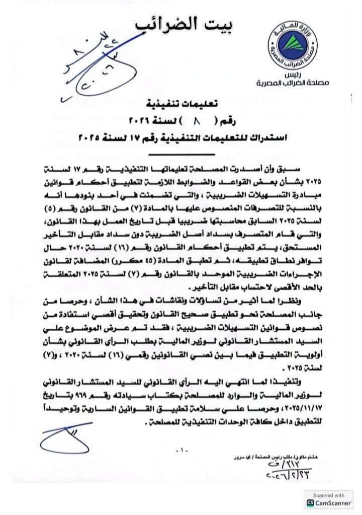 أصدرت مصلحة الضرائب التعليمات التنفيذية رقم 8 لسنة 2026، والتي جاءت استدراكا للتعليمات التنفيذية رقم (17) لسنة 2025، في إطار الحرص على التطبيق السليم والدقيق لأحكام القوانين المنظمة لمبادرة التسهيلات الضريبية، وضمان وضوح الرؤية وتوحيد التطبيق داخل كافة الوحدات التنفيذية.