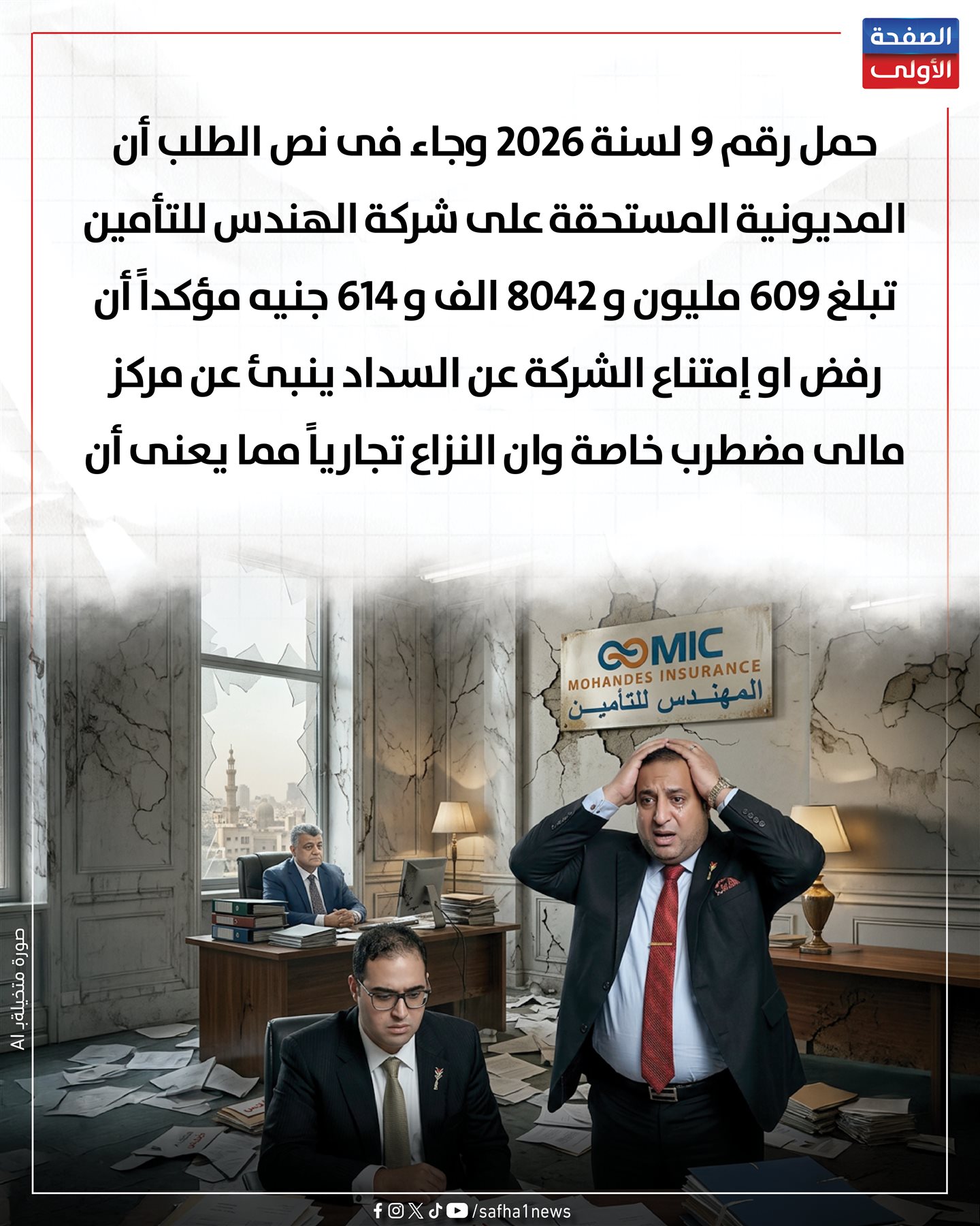 فى تصعيد جديد لأزمة شركة "المهندس للتأمين" ونزاعها القضائى والزامها بسداد قرابة 610 مليون جنية لصالح شركة ميراج للفنادق والتى إمتنعت شركة المهندس عن سدادها رغم إخطارها رسمياً بالحكم الصادر والمؤيد إستئنافياً.