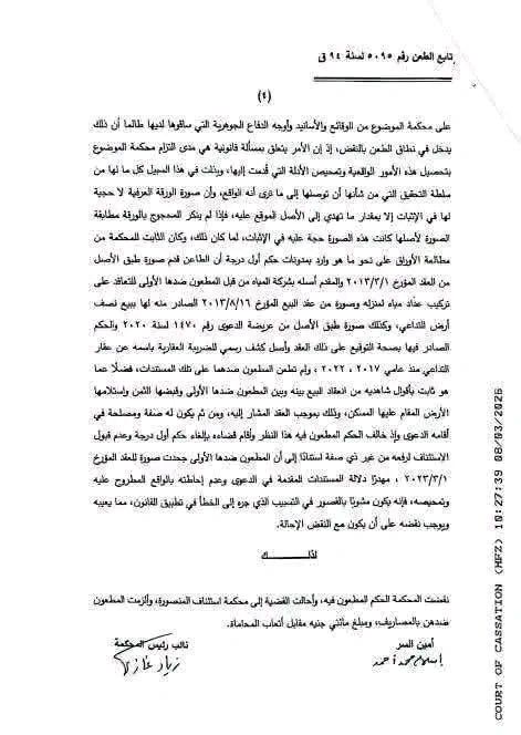 وأضافت محكمة النقض في حكمها، أنه قد ثبت لديها من مطالعة الأوراق أن الطاعن قدم صورة طبق الأصل من العقد والمقدم أصله بشركة المياه من قبل المطعون ضدها الأولى، للتعاقد على تركيب عداد مياه لمنزله، وصورة من عقد البيع الصادر منه لها ببيع نصف الأرض محل الدعوى، وكذلك صورة طبق الأصل من عريضة الدعوى رقم 1470 لسنة 2020 والحكم الصادر فيها بصحة التوقيع على ذلك العقد، وأصل كشف رسمي للضريبة العقارية باسمه عن عقار التداعي منذ عامي 2017، 2022.