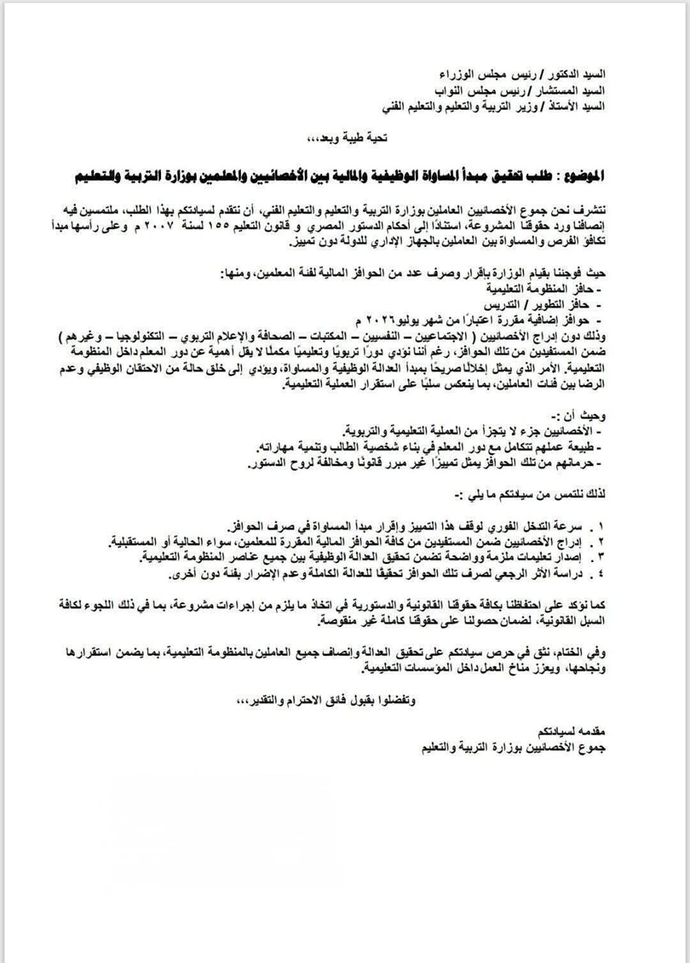 أزمة الأخصائيين في المدارس لم تتوقف عند صرخات الغضب عبر مواقع التواصل الاجتماعي، بل امتد إلى تحرك رسمي، حيث تقدم جموع الأخصائيين بوزارة التربية والتعليم والتعليم الفني بطلب عاجل إلى رئيس مجلس الوزراء ورئيس مجلس النواب ووزير التربية والتعليم، للمطالبة بتحقيق المساواة الوظيفية والمالية.