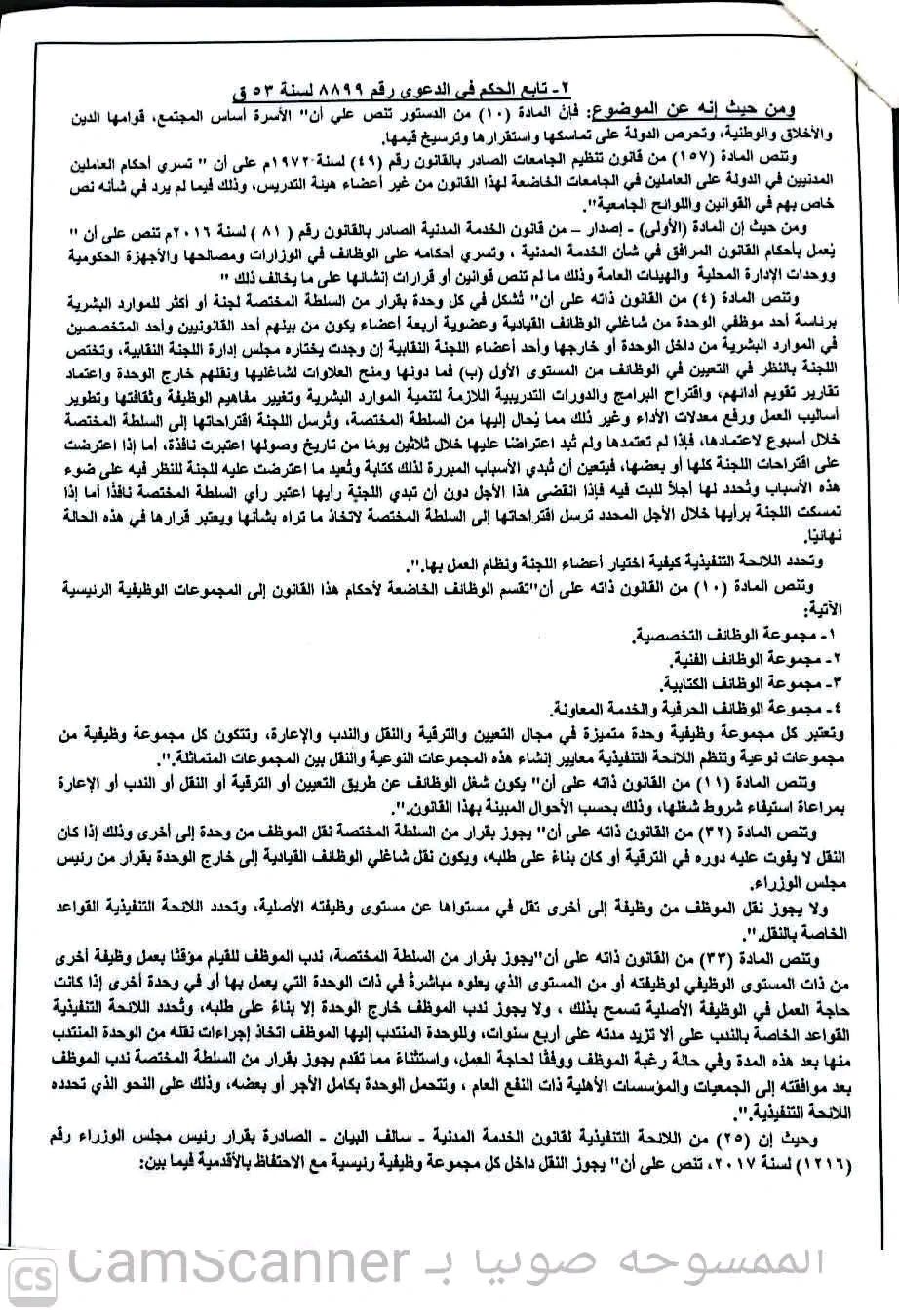 وأضافت المحكمة الإدارية لمحافظة الغربية، أن المادة (10) من الدستور تنص على أن الأسرة أساس المجتمع، قوامها الدين والأخلاق والوطنية، وتحرص الدولة على تماسكها واستقرارها وترسيخ قيمها، كما تنص المادة (157) من قانون تنظيم الجامعات الصادر بالقانون رقم (49) لسنة 1972م على أن "تسري أحكام العاملين المدنيين في الدولة على العاملين في الجامعات الخاضعة لهذا القانون من غير أعضاء هيئة التدريس وذلك فيما لم يرد في شأنه نص خاص بهم في القوانين واللوائح الجامعية".
